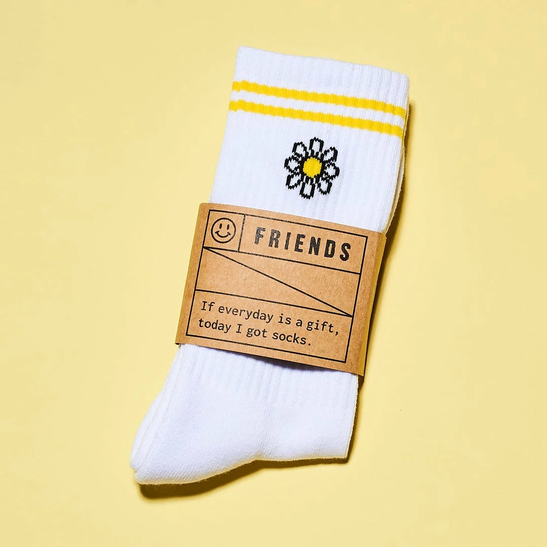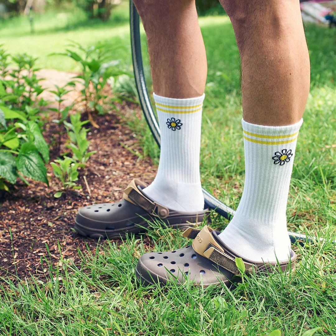 Each sock is knit with a white daisy flower with a yellow center. Top of sock features a matching yellow double line.