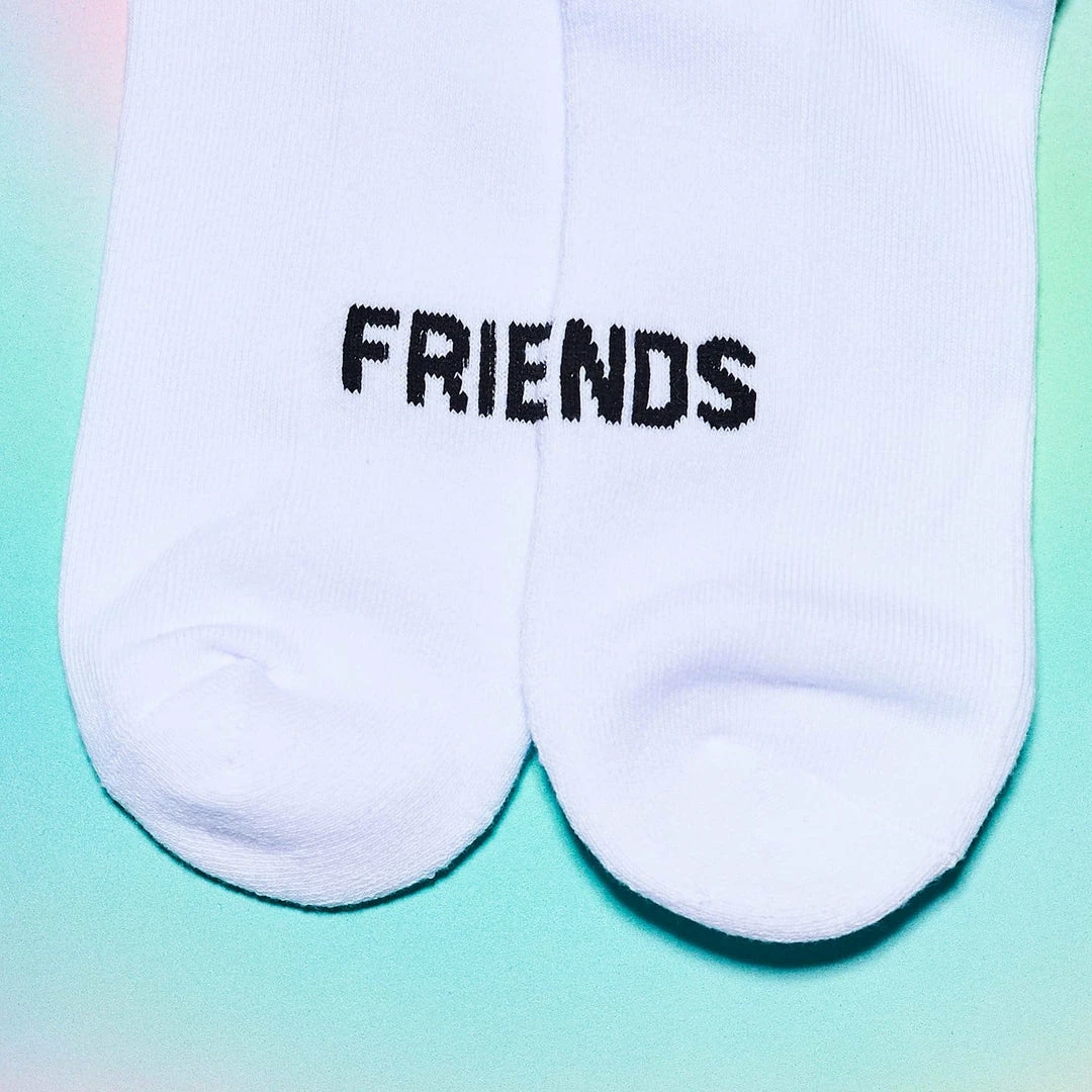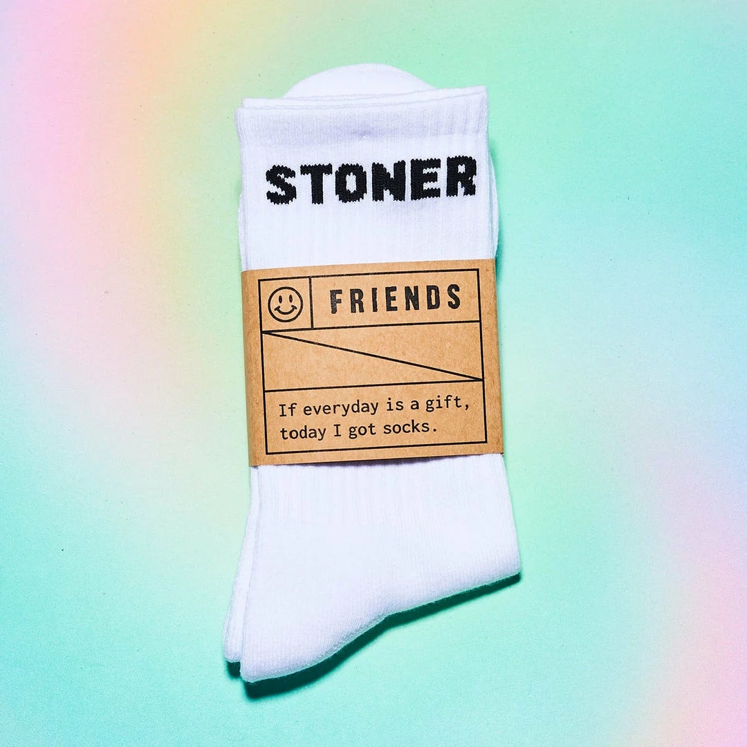 Each sock is knit with STONER on outer side and with FRIENDS at the bottom.