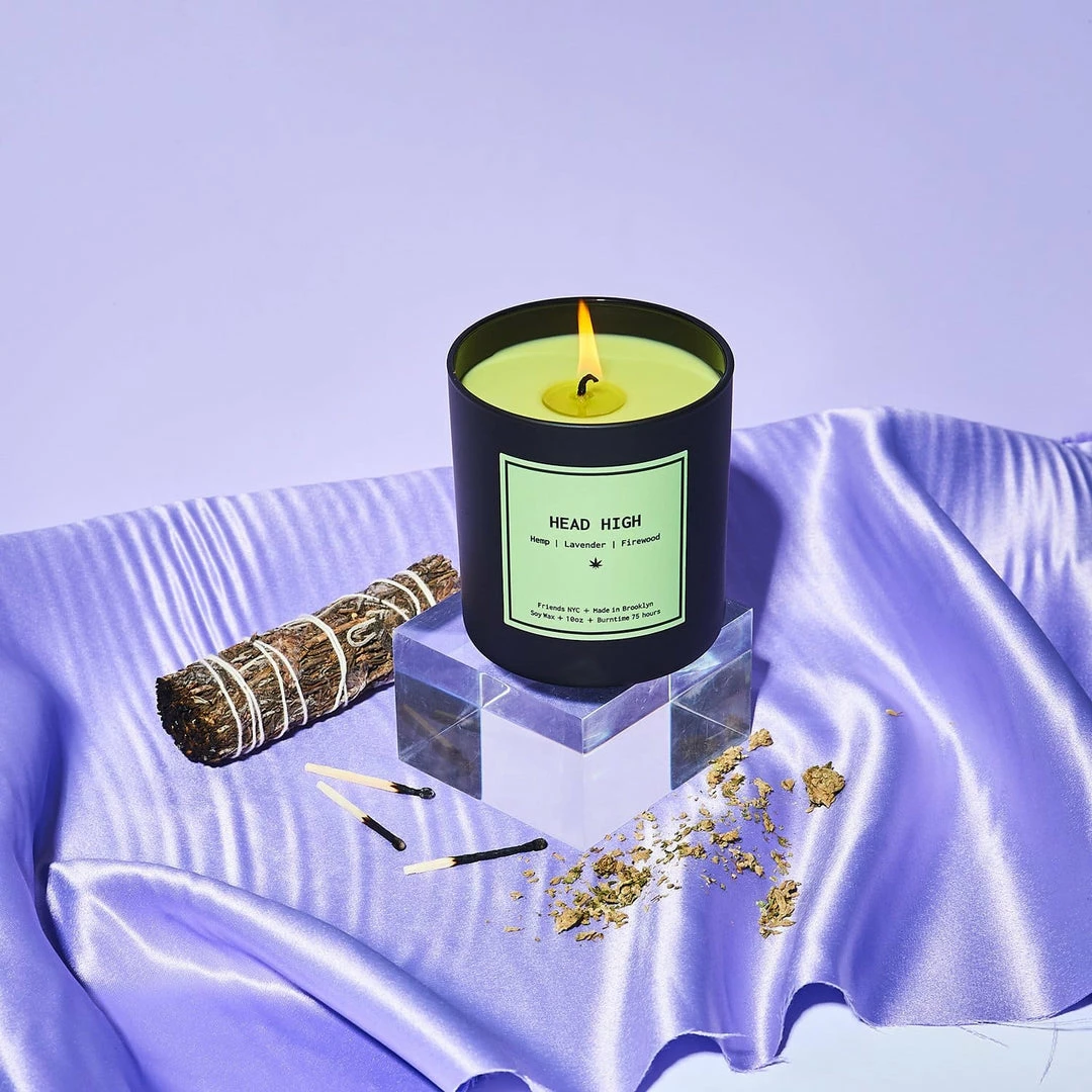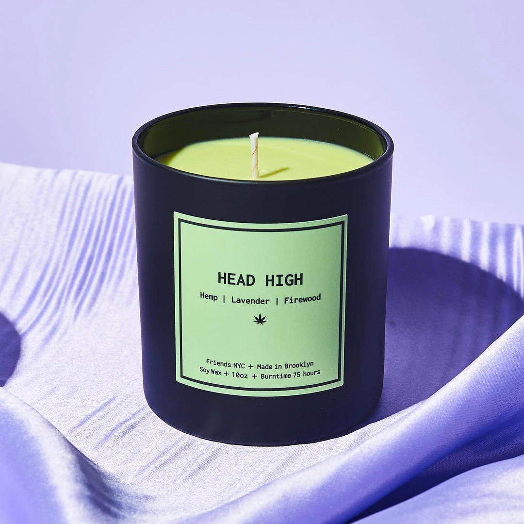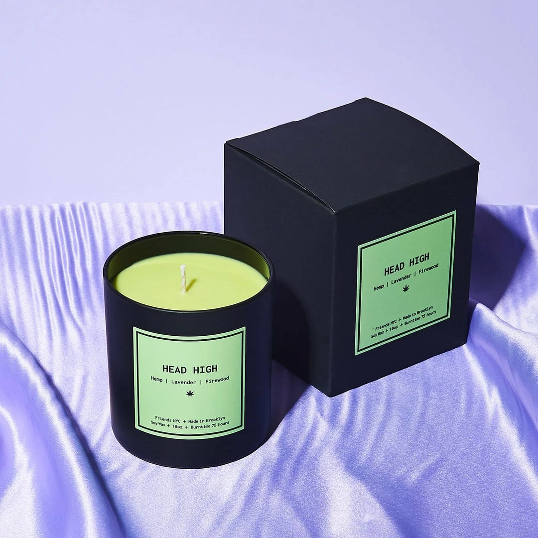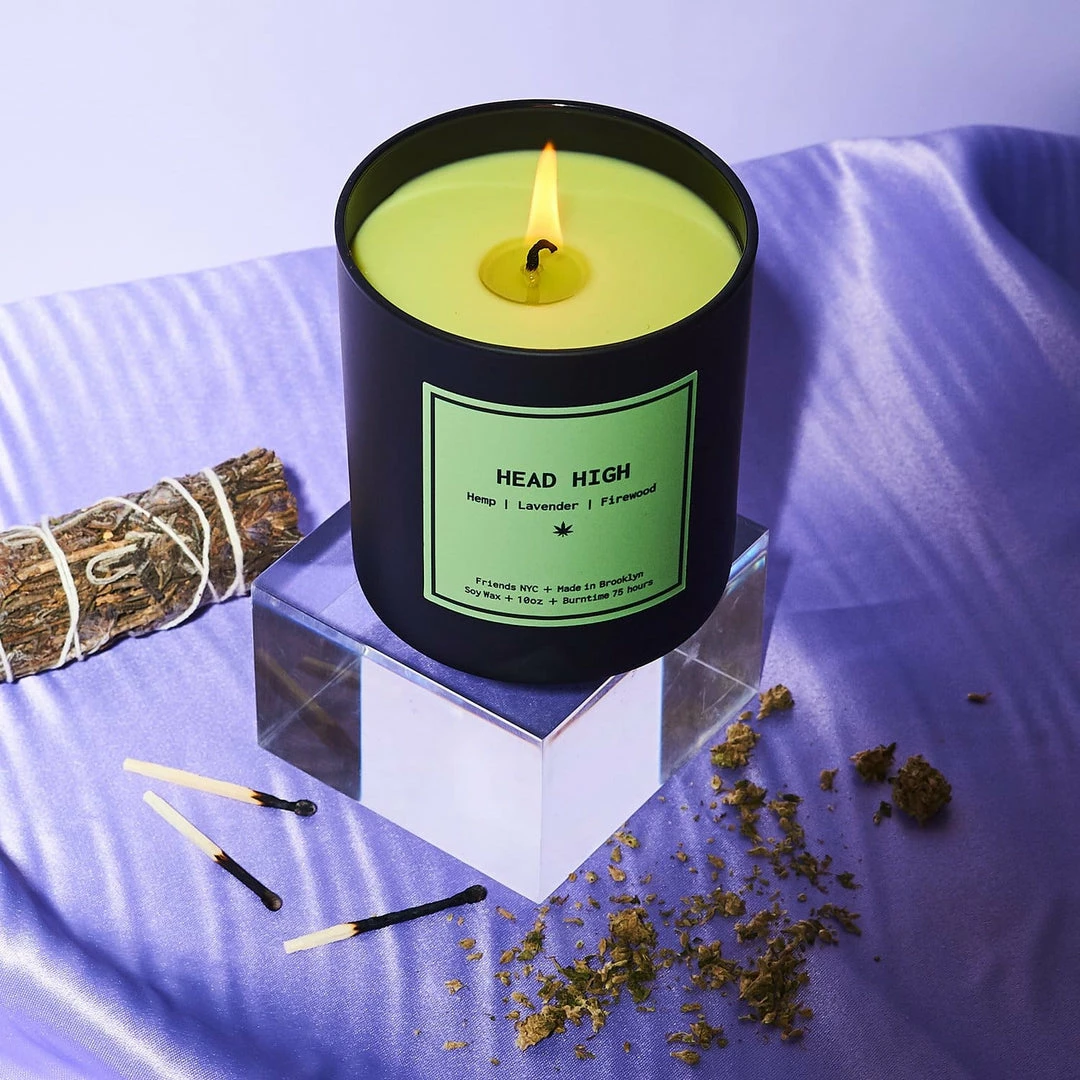 Welcome to high holiday season! Our newest Friends NYC candle is designed to give you that extra head high. This candle was inspired by staying warm by the fire and staying lifted for the holidays. The intoxicating scent notes of hemp, lavender, and firewood are the perfect compliment to freshly burned grass. A perfect stoner gift, especially for those that appreciate the aroma of their herbs. Displayed in a matte black vessel with chic green wax, this candle is ready to be gifted in its matching box.