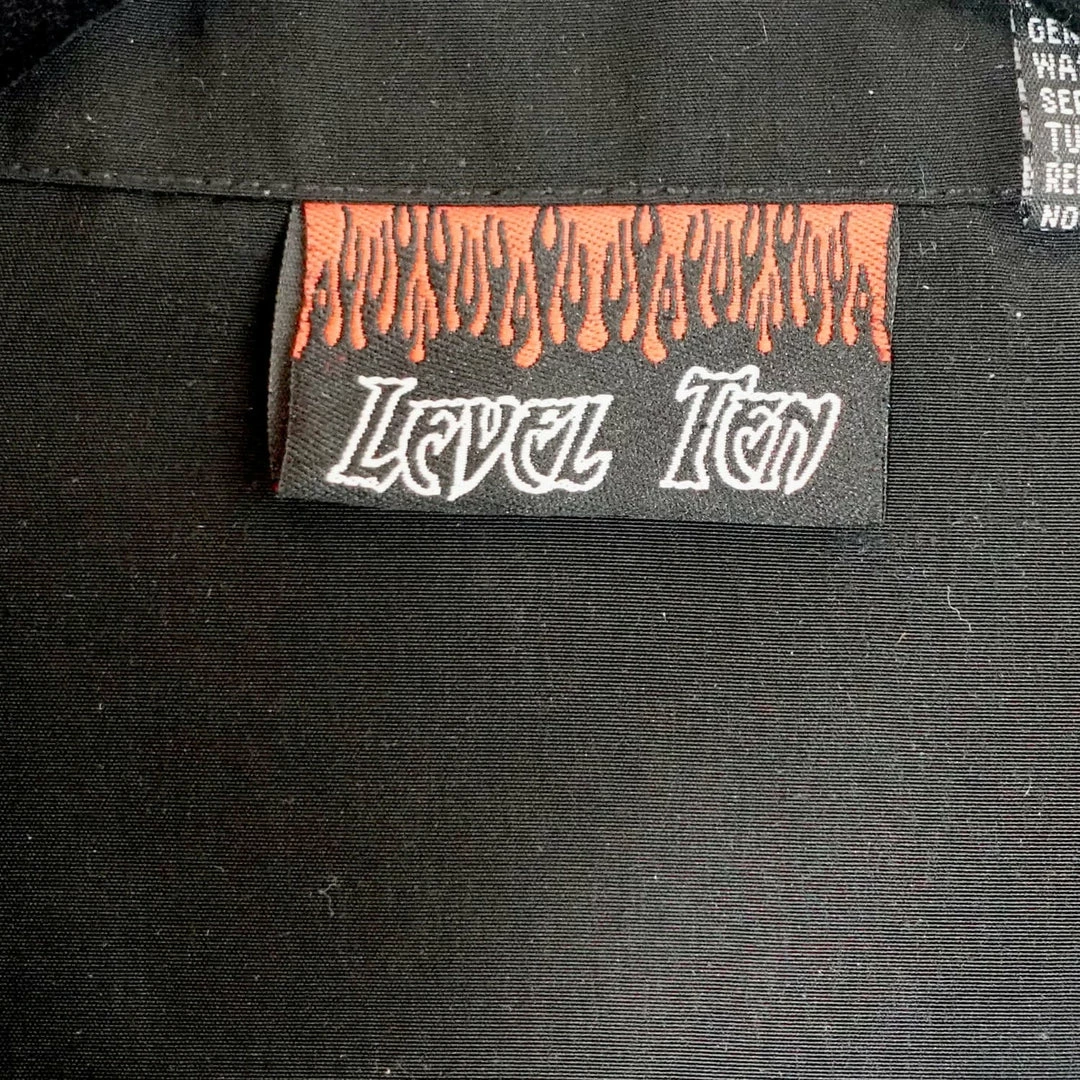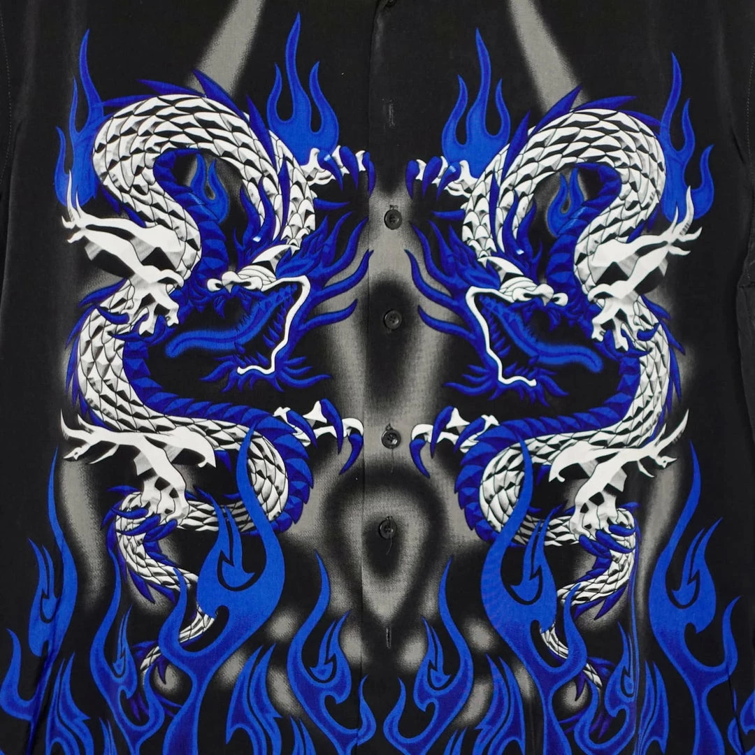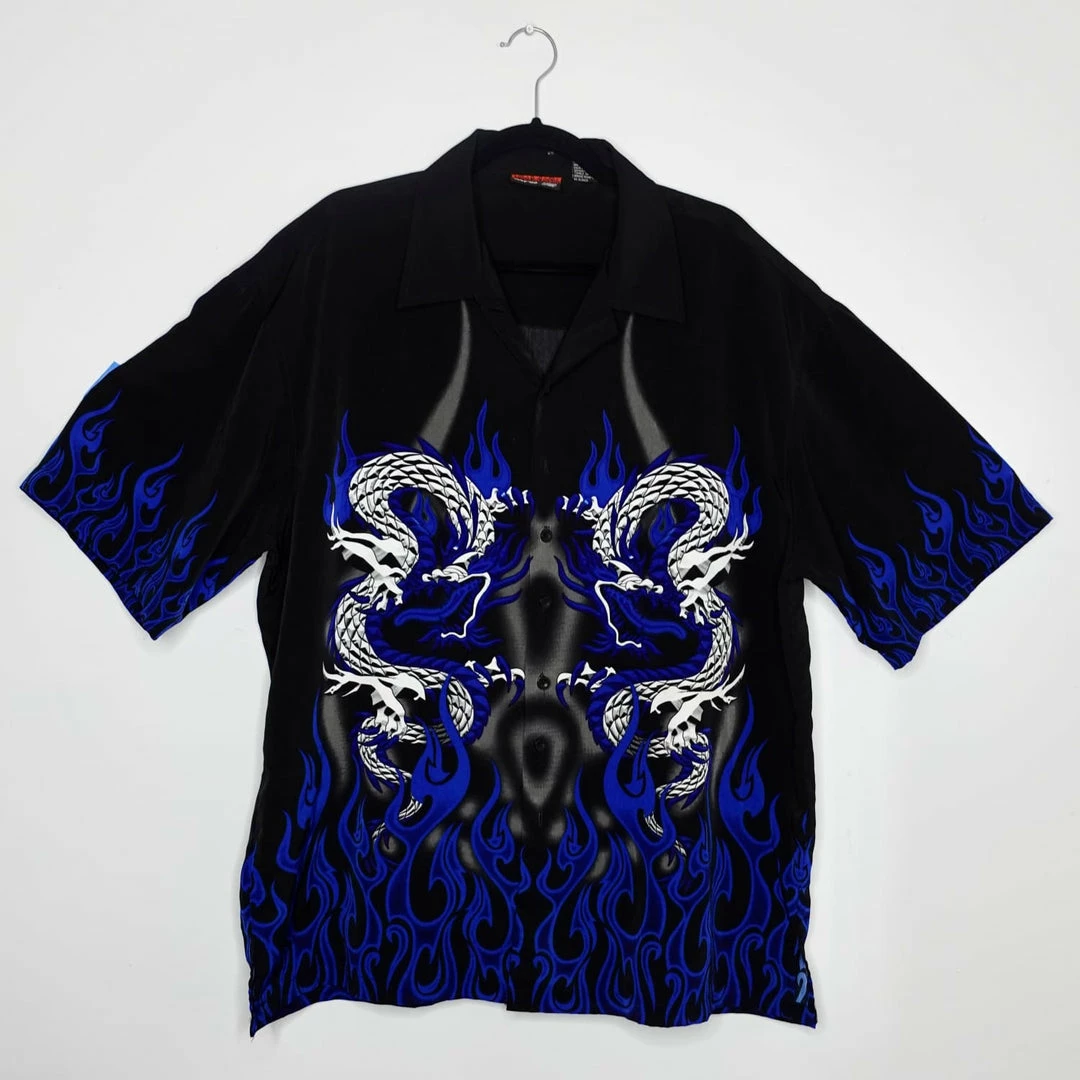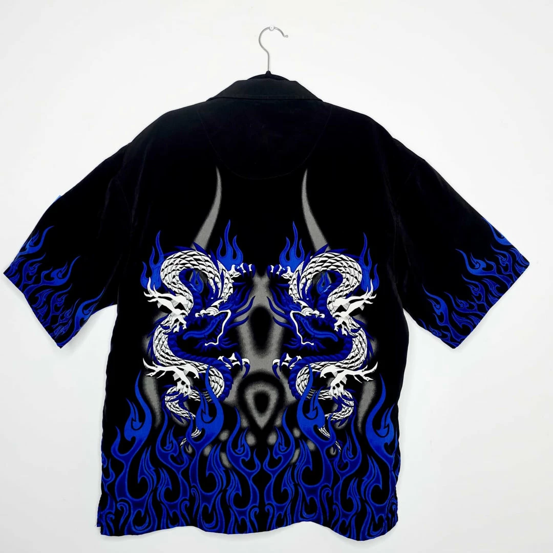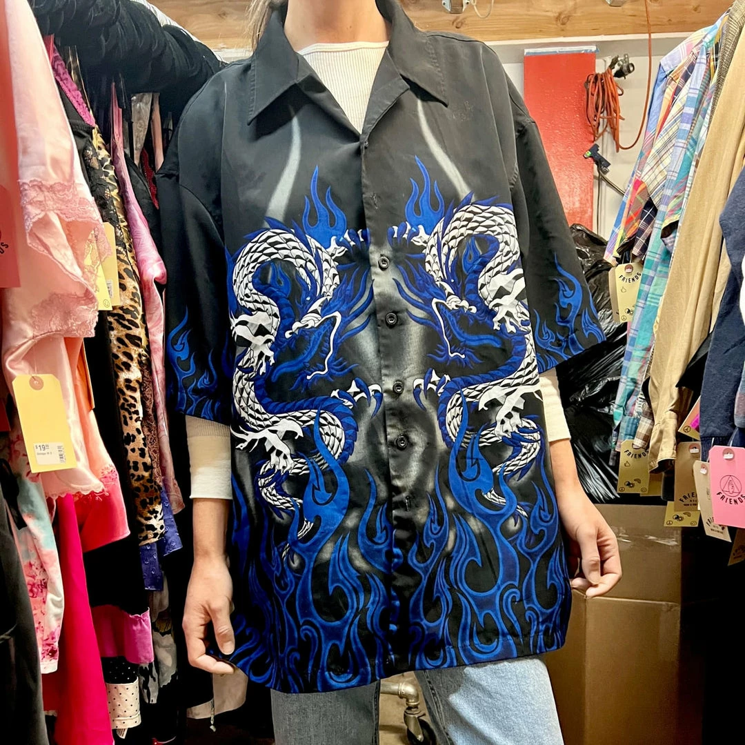 Spike up your hair and throw on some wrap around shades because you’ll be feeling that 90s vibe after you put this button up on. From the brand Level 10, the boxy shirt features two mirrored dragons on either side with blue flames rising from the bottom and the sleeves.