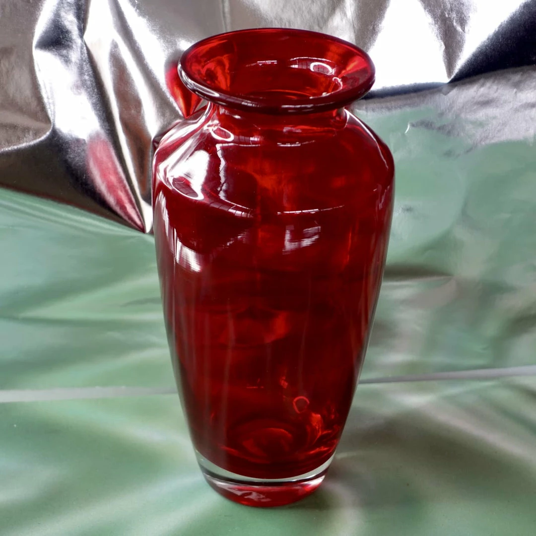 Fall in love with this deep red, tall glass vintage vase. Use traditionally with a floral arrangement on a table top. Even better, place twinkly holiday lights within create a soft and festive look. Build on that holiday idea by pairing with our vintage green glass vase.