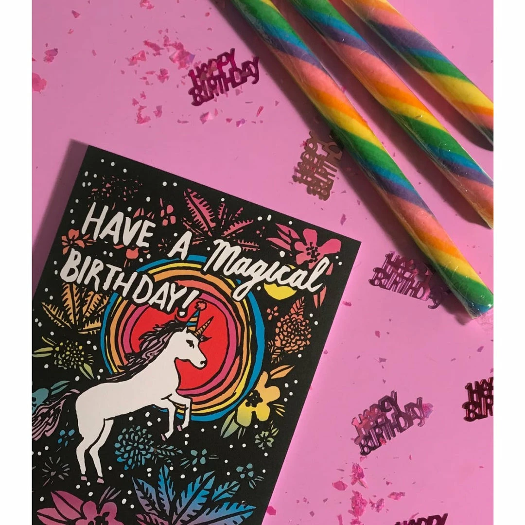What’s more magical than a unicorn? Wish your bestie or ya boo a happy birthday with this aesthetic rainbow gradient greeting card. Features a unicorn midstride against a contrasting black and rainbow background. Front of card reads, “Have a magical birthday!”