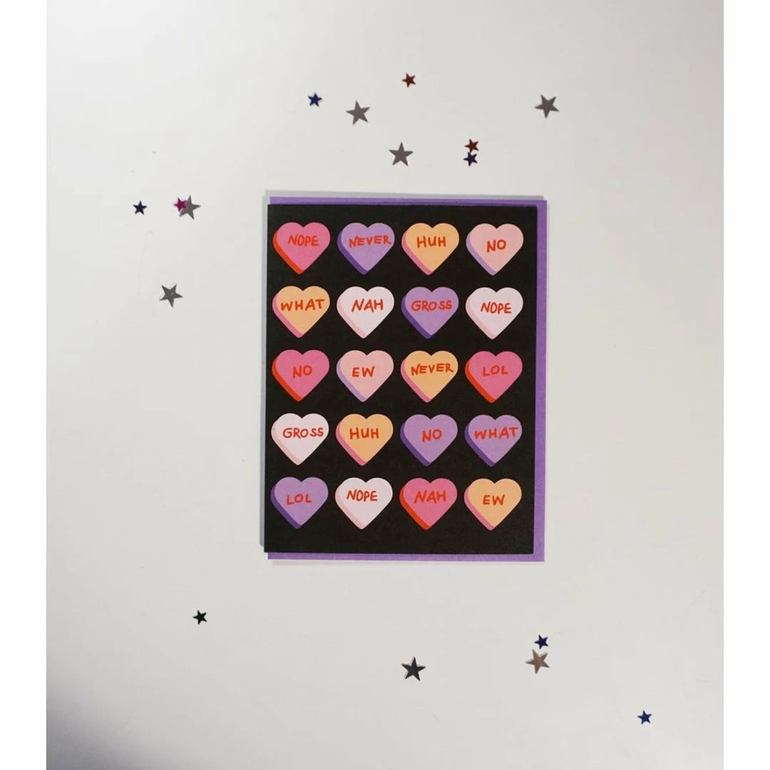 Ugh, as if! For the couple that only speak in sarcasm or the ones that make fun of things like Valentine’s Day. In a patterned grid, there are varied heart candies with non-tradional words of romance like: Ugh, Nope, Never, Gross, LOL. We effin love it!