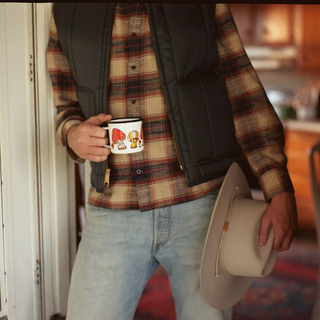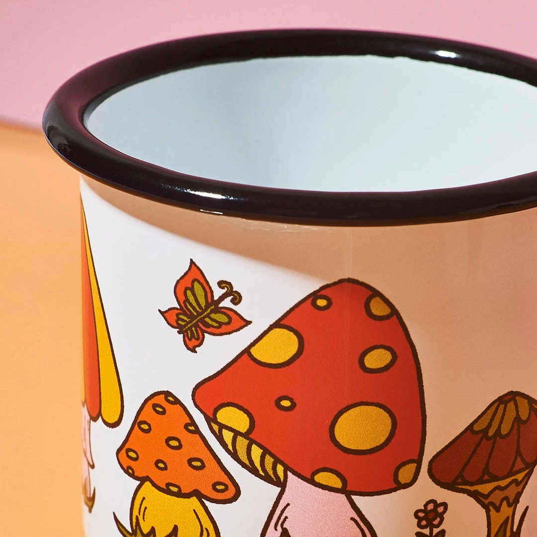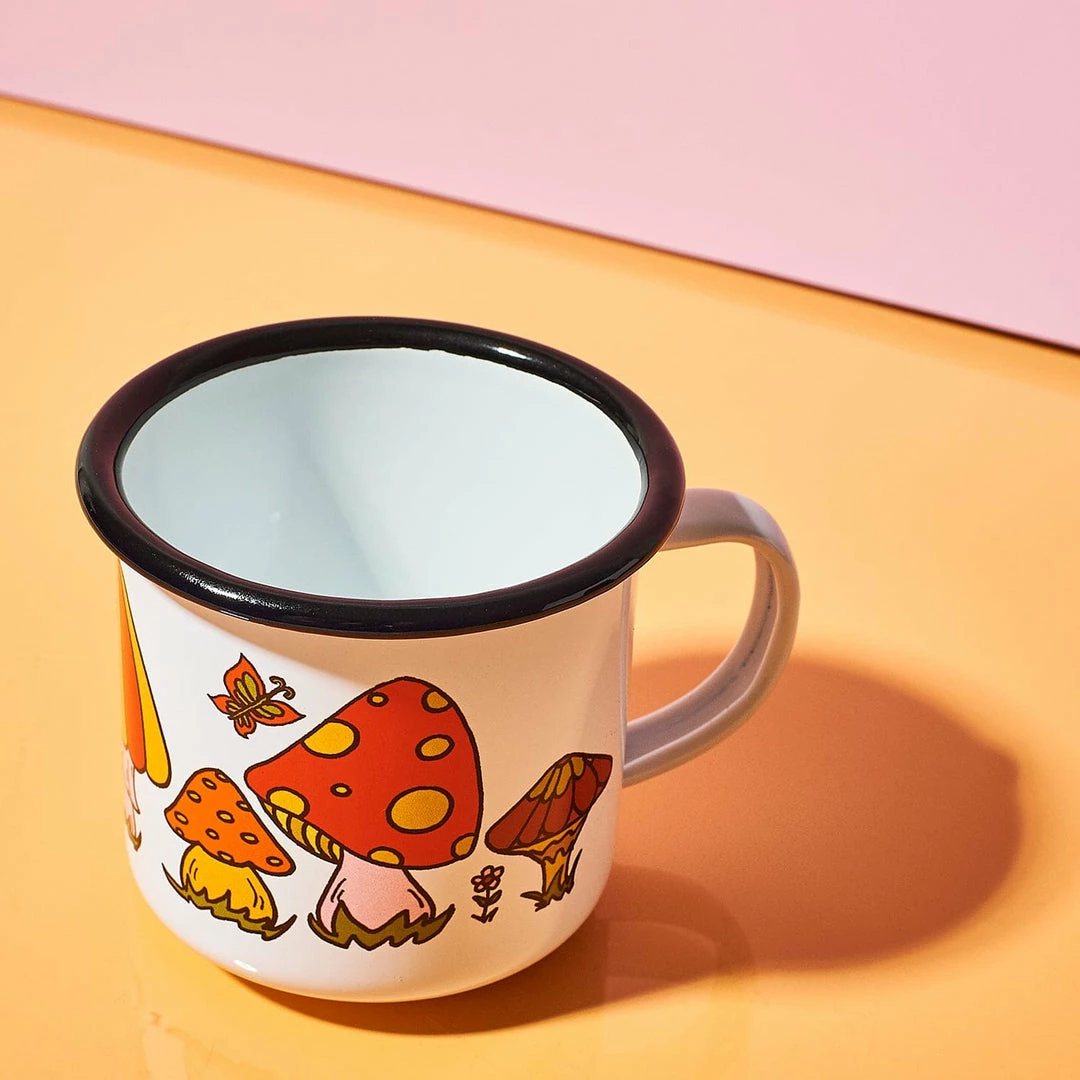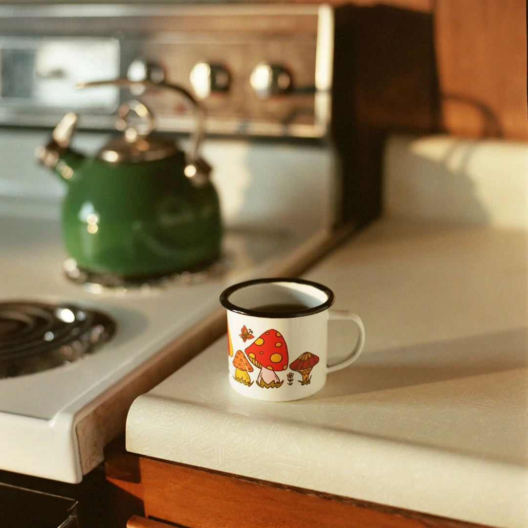 Enamel camping mugs are a true staple of outdoor enthusiasts. Styled with a retro, vintage styled mushroom scene wrapped all away around. this enamel mug is a woodsy edition to your mug collection. Use as your go to coffee mug when camping and at home. Made of thick enamel with a shatterproof design, so you can comfortably use this over a fire.