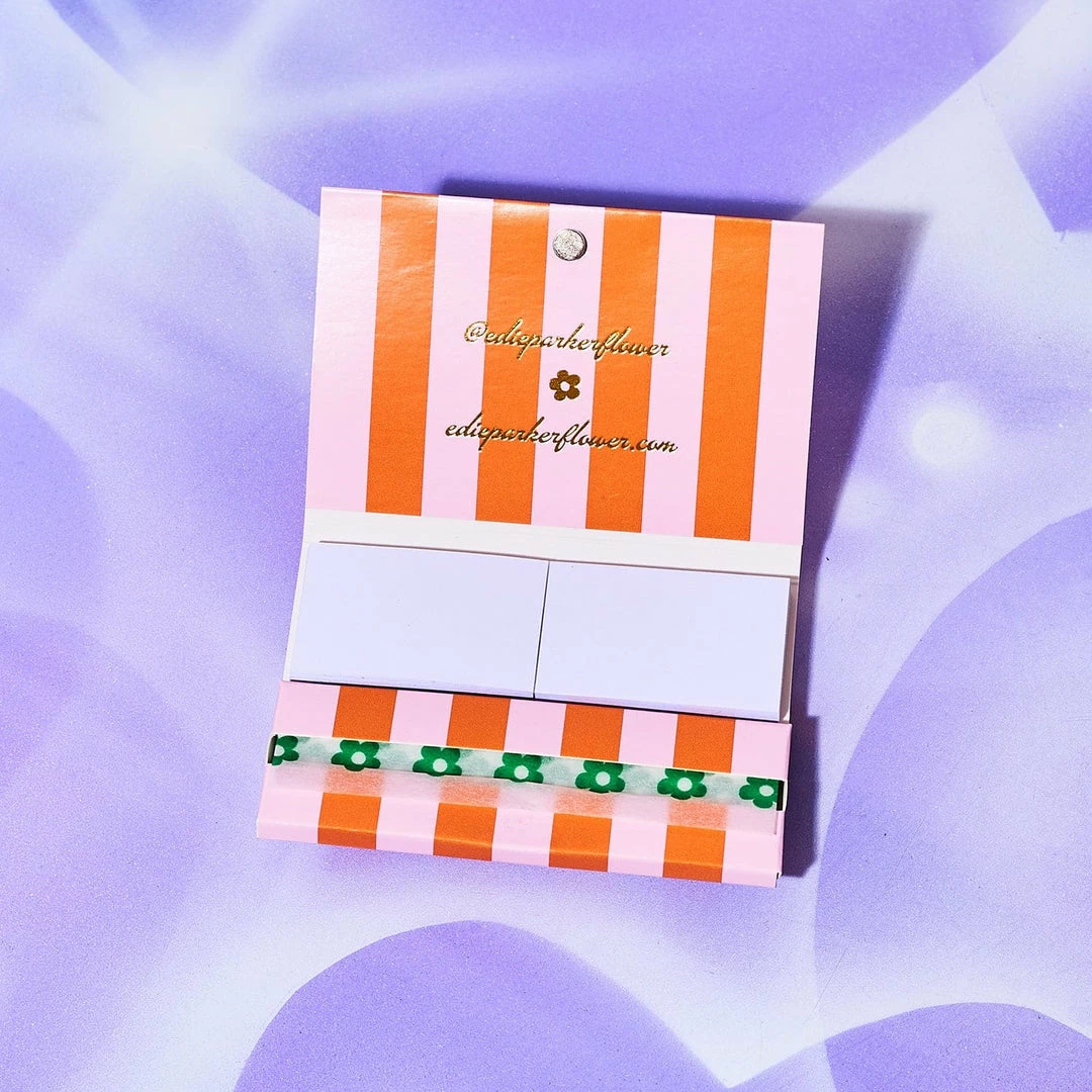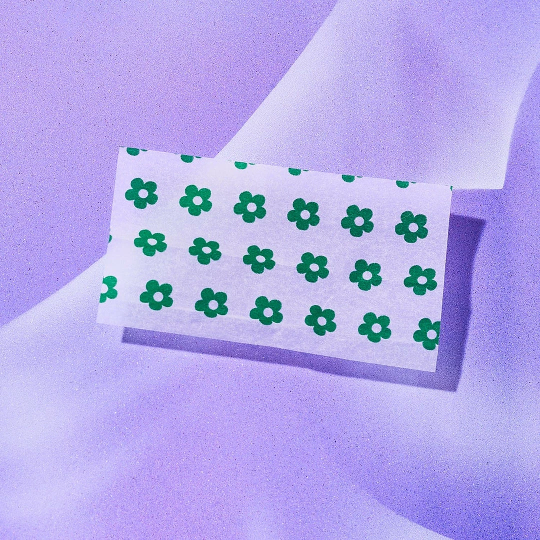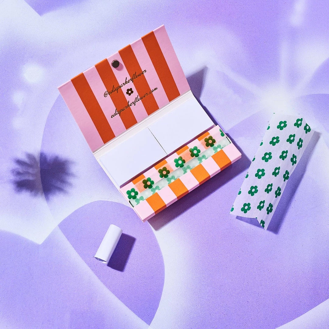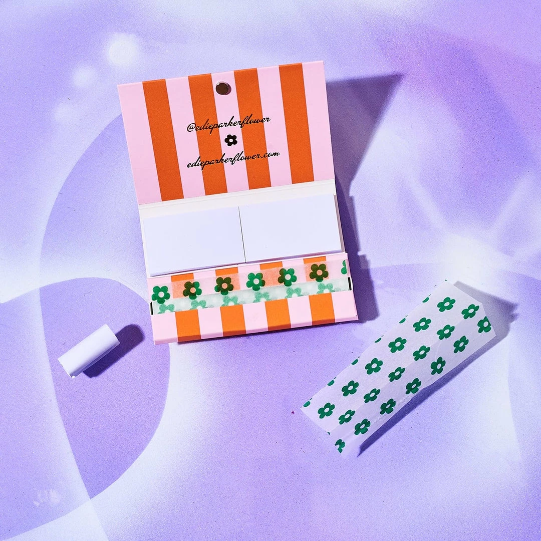Super thin, patterned rice rolling papers from Edie Parker. Featuring green daisy flower print all over the transparent paper. Green flower, get it? 😉 Also available in rainbow!