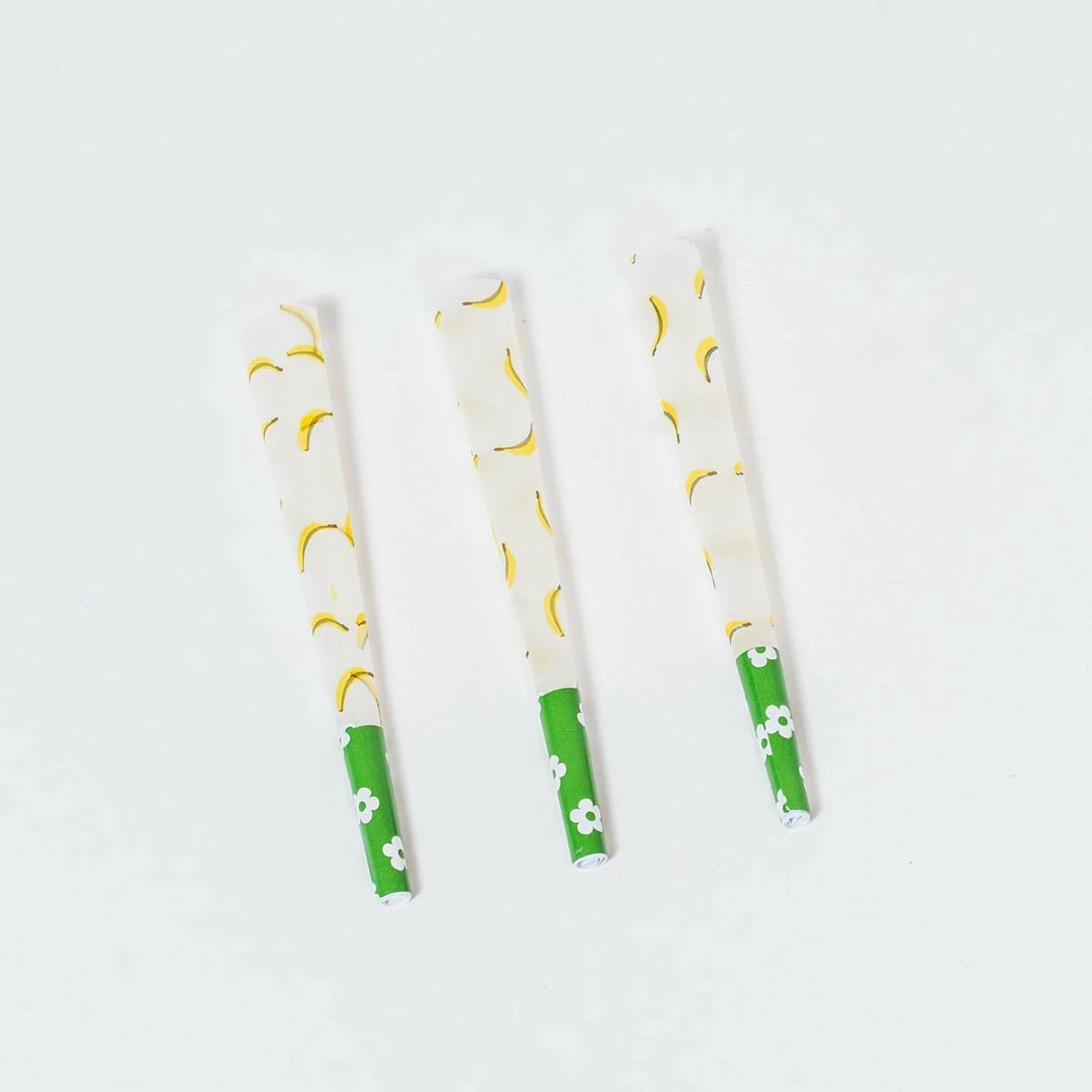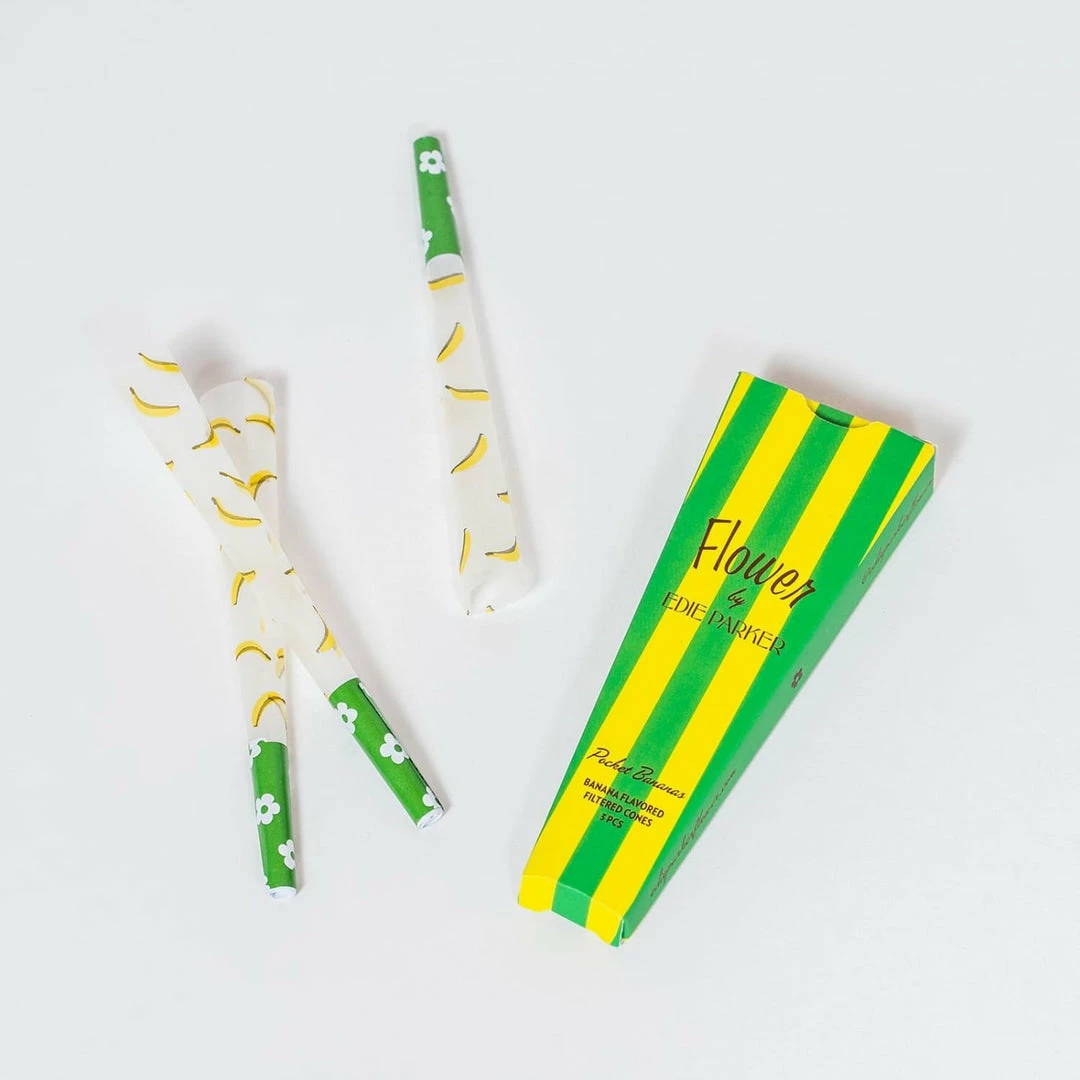 What an aPEELing way to smoke up. Edie Parker does it again with their new banana printed pre-roll cones, ready for you to enjoy! Just add the herb of your choice, get it perfectly filled with the aid of the included tamping stick, and twist shut. Cones feature a green filter tip with white daisies.