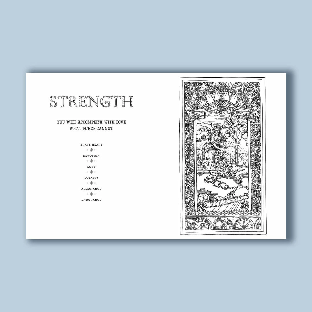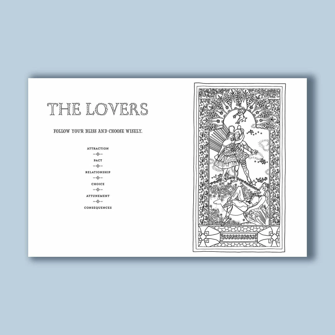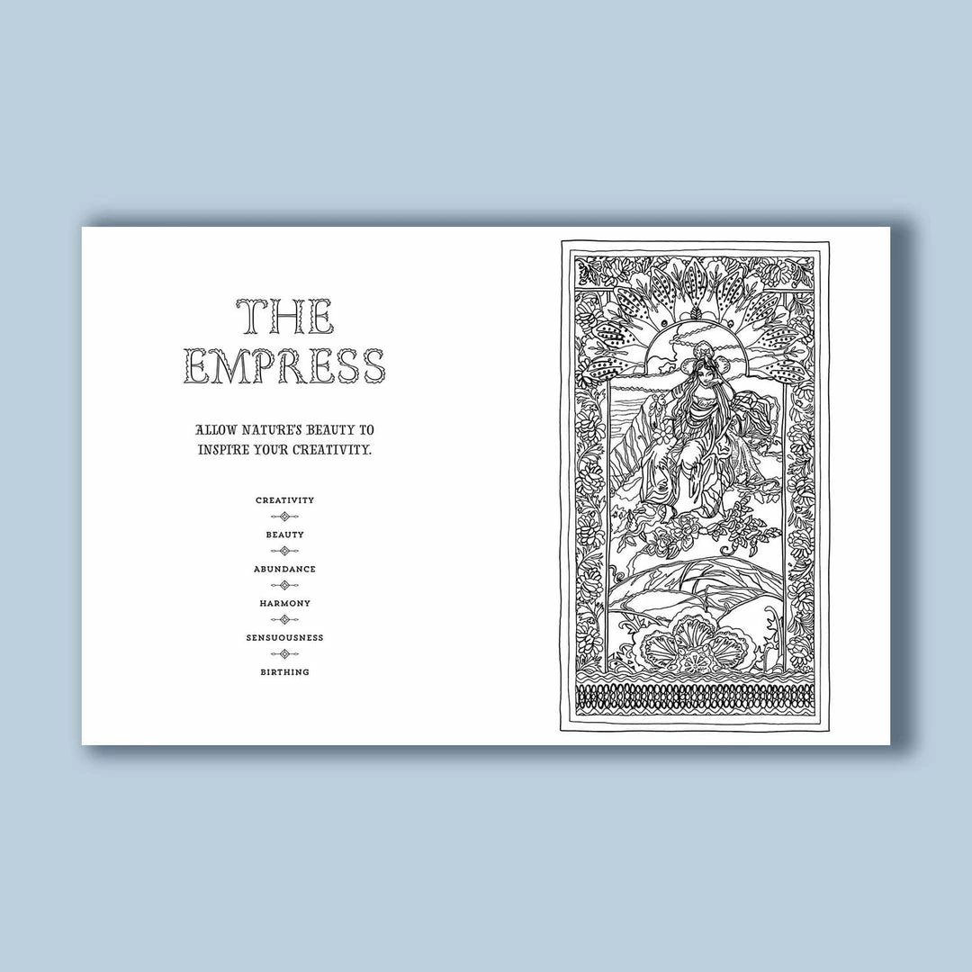 The forty line drawings are accompanied by text that guides colorists through each suit of the deck, introducing all the key players of the major and minor arcana, from The Fool to The Magician to The Empress.