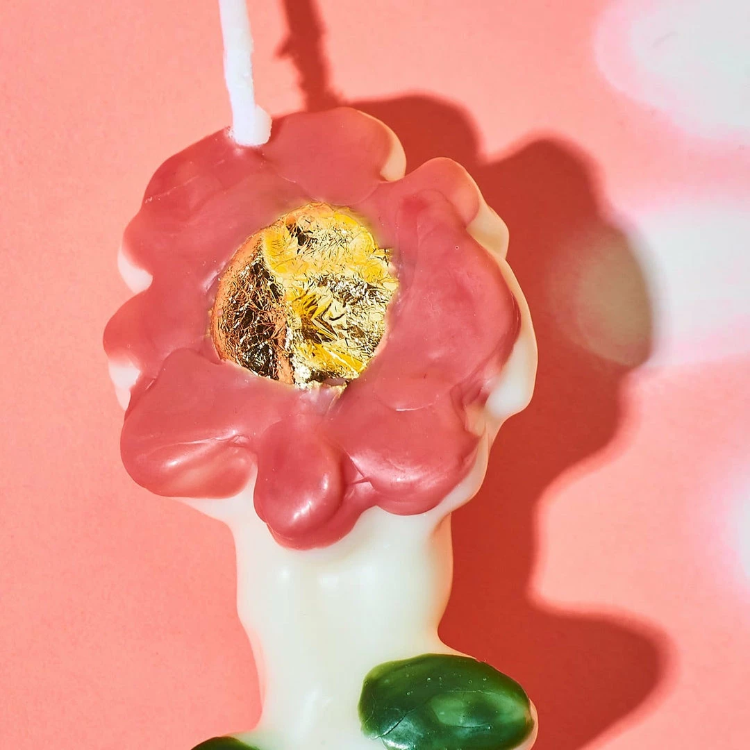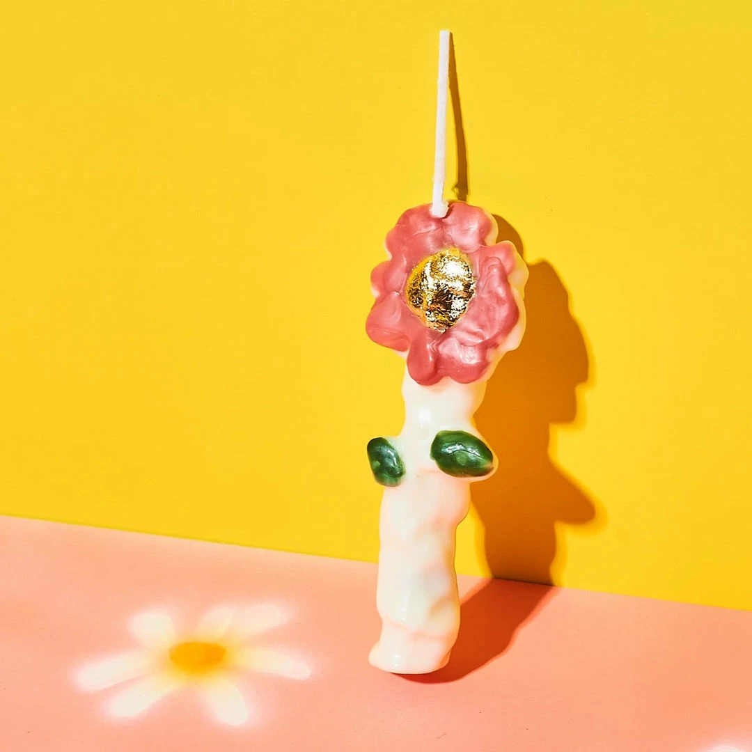 Keep a spring time floral feel year round with the Pretty Petal Taper Candle by Janie Korn. Features warm coral petals and a gold foil center. Taper Candle body acts as the stem, with green leaves. Artfully handcrafted and shaped, this flower candle is functionally a mini sculpture, and will add a pop of personality to your space. Style near your regular use candlesย for funzies or perhaps near some of your indoor potted plants.