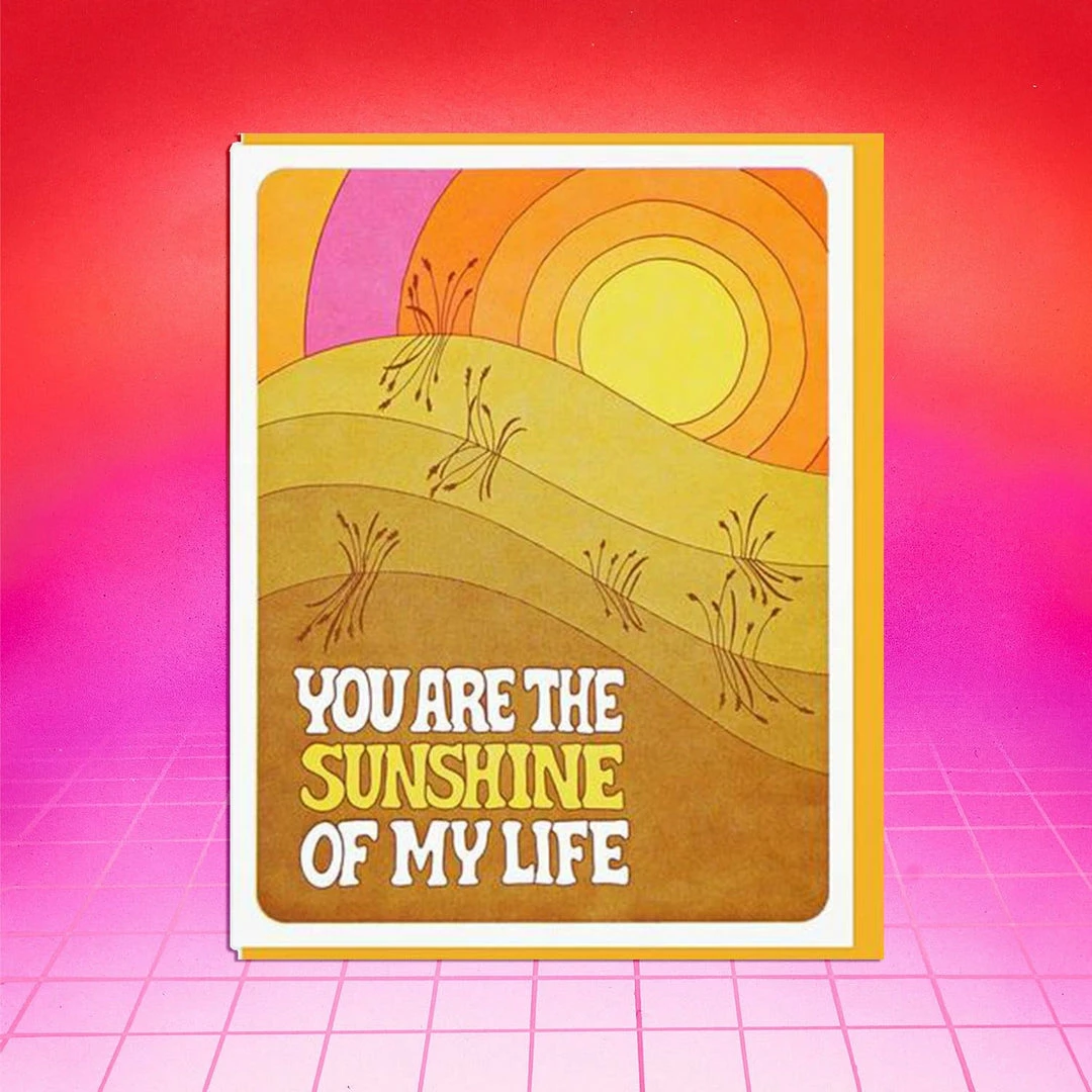 Add a little analog romance in this digital world. Serving up major 70s vibe, this illustrated designed from Lucky Horse Press. Front of card has rolling hills and a warm sunset. Text in bottom left reads “You are the sunshine of my life.”