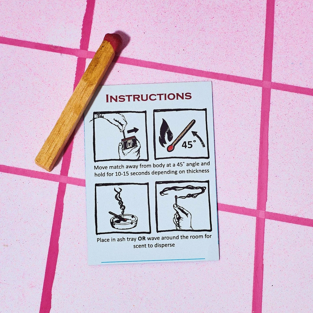 Cleanse your space or introduce a new ritual item with these palo santo incense matches. Dipped in red wax for striking against the matchbox. Once aflame, let the fire grow for a few seconds to give stick an opportunity to burn through wood and smolder sufficiently before blowing out. Watch the smoke rise and feel the palo santo scent fill your space, pushing out any negative energies. The palo santo used is 100% sustainably harvested in Peru from fallen trees and packs a particular high resin content. ย