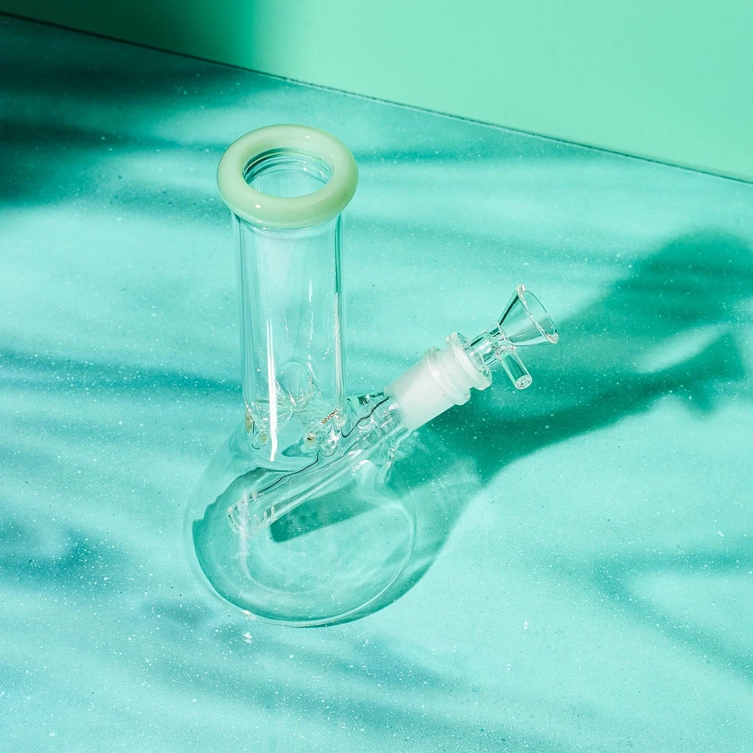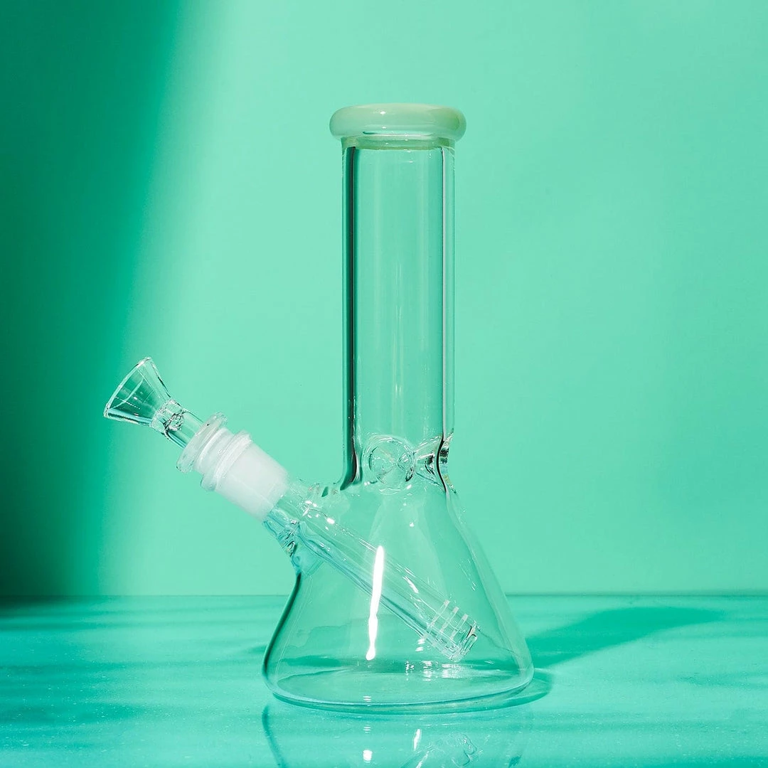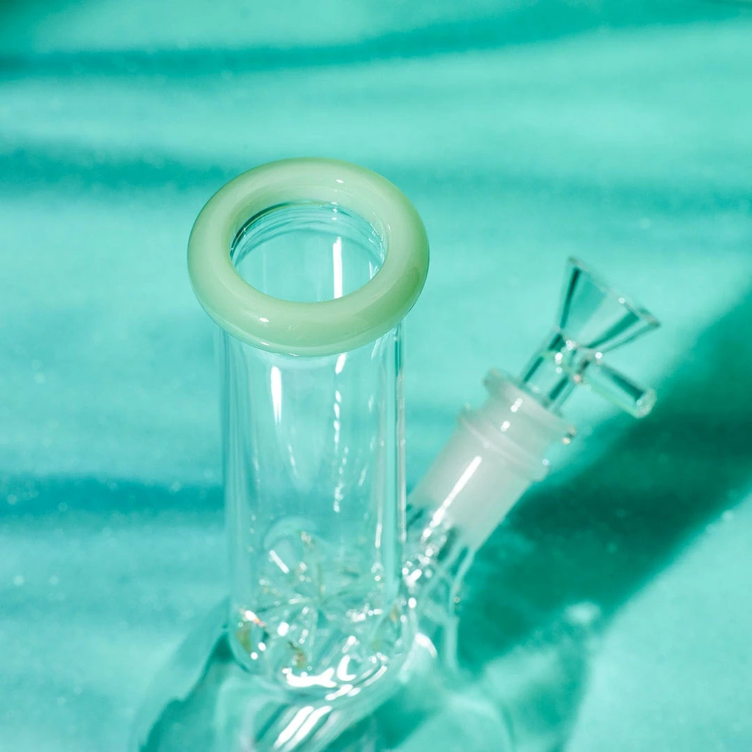 Minimalistic chic that will coordinate in any home and all types of stoners. The small clear glass beaker features aย conical base body shape, accented only by its jade green opaque mouth rim. Comes with a 14mm down stem and built in ice catcher pokes.
