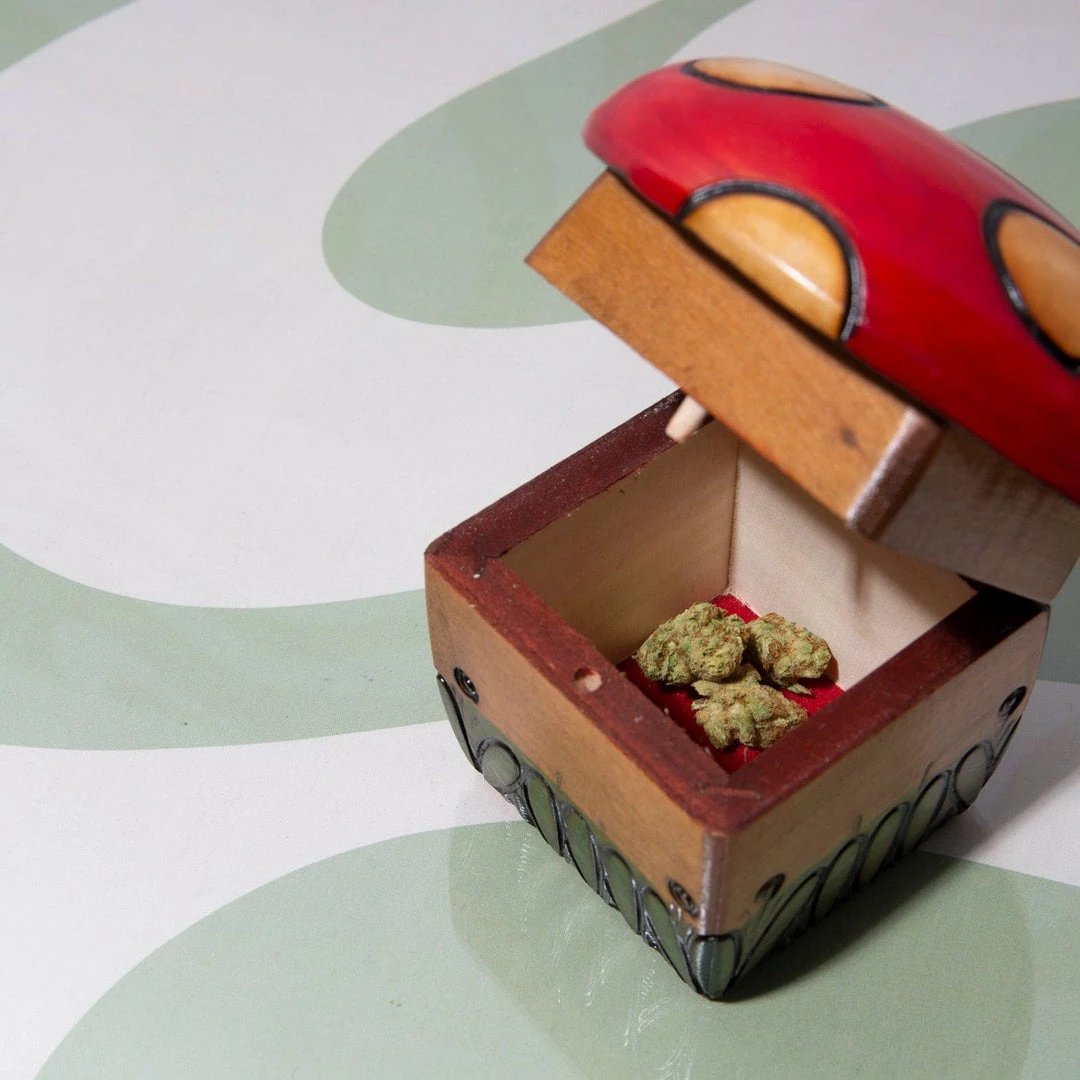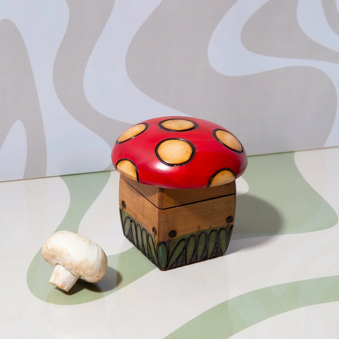 Get woodsy with this mushroom trinket box. Straight out of your mushroom decor dreams, this little wooden box can be used to hold many a treasure. Box lid features a white dotted red mushroom cap, with base depicting the mushroom stem and green grass it’s sitting in. Keep at your nightstand to hold your errant jewelry. Or, use at a not so subtle stash box to keep your ready to use treats from mother natureย contained and easy to access.