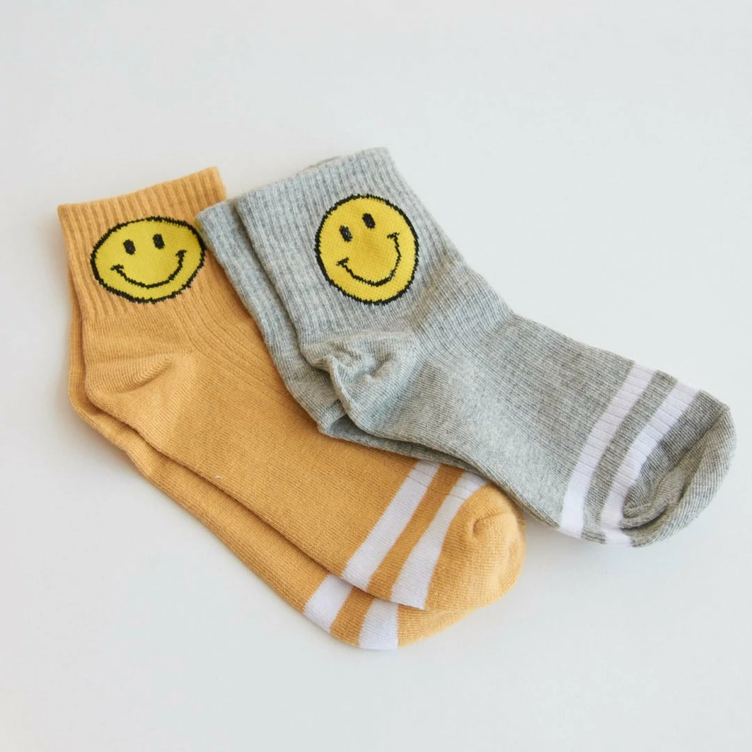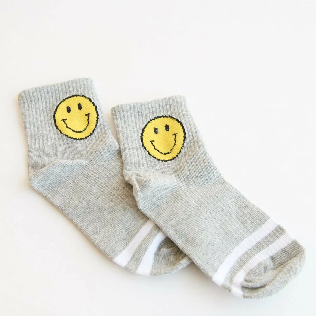 These adorable smiley socks are sure to put a pep in your step. Super bright colors combine with fun stripes and aΒ positiveΒ attitude make them the happiest athletic tube socks around. Also available in yellow.