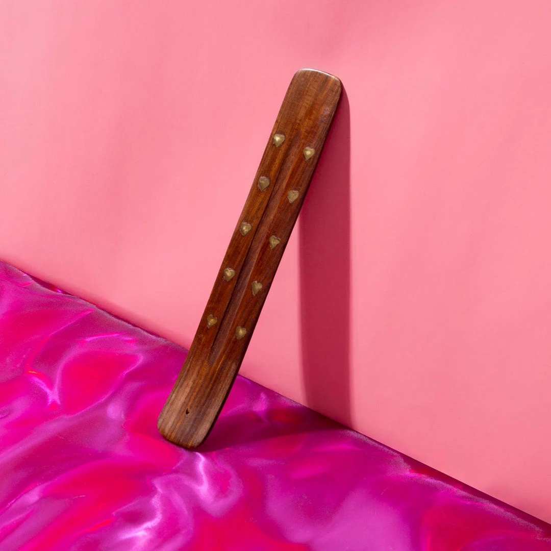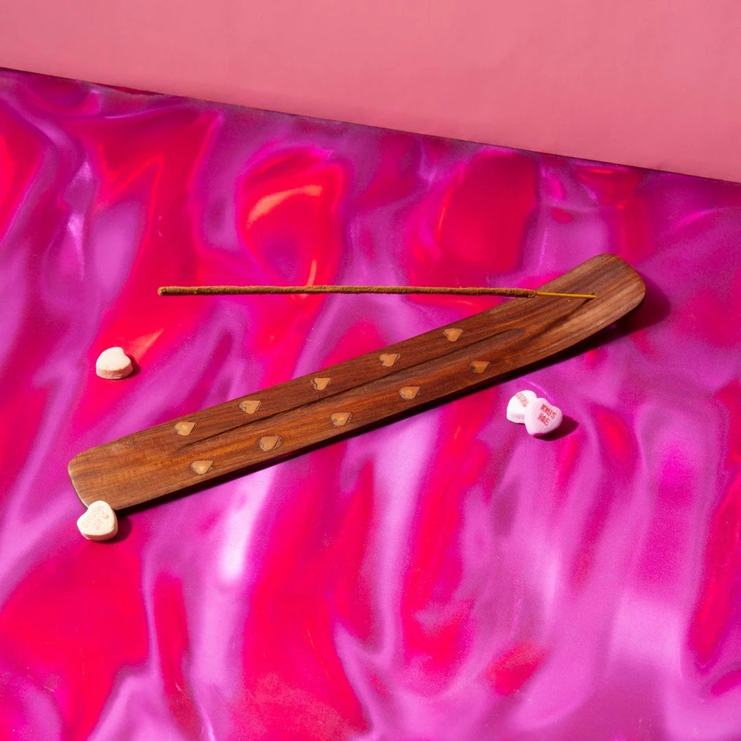 Set the mood and match the passion aflame in your heart with this heart adorned incense holder. Suitable for stick and cone incense. Place stick incense in small hole at one end with the slight lift. Center has a groove to help catch incense ash.