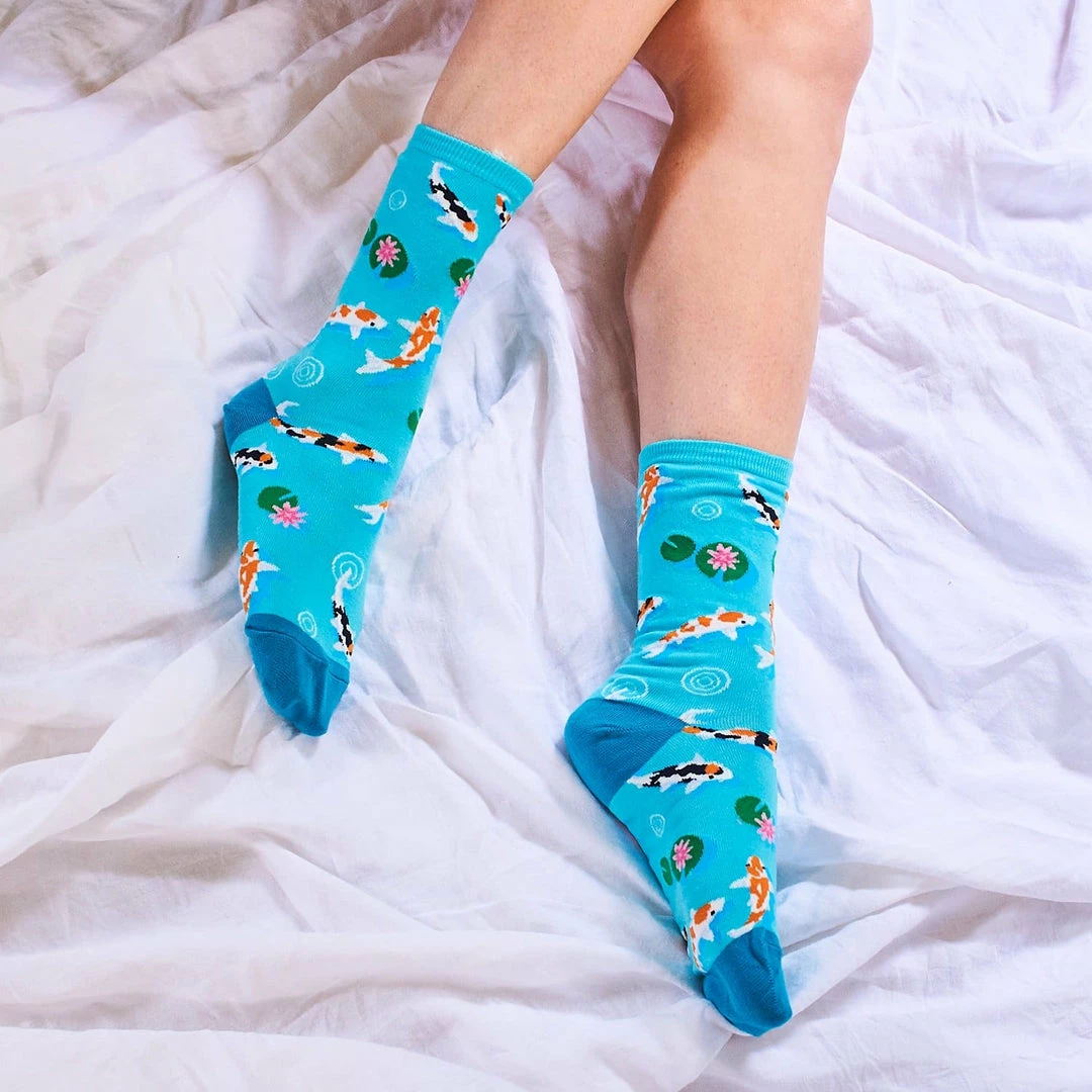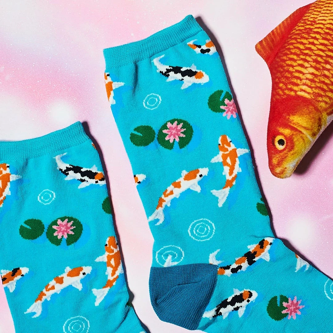 Zen out and reflect with your on the move koi pond 😉 Light blue, two toned cotton novelty sock features an illustrated pond with koi fish, lily pads, and surface bubbles. For the fun and peaceful at heart.