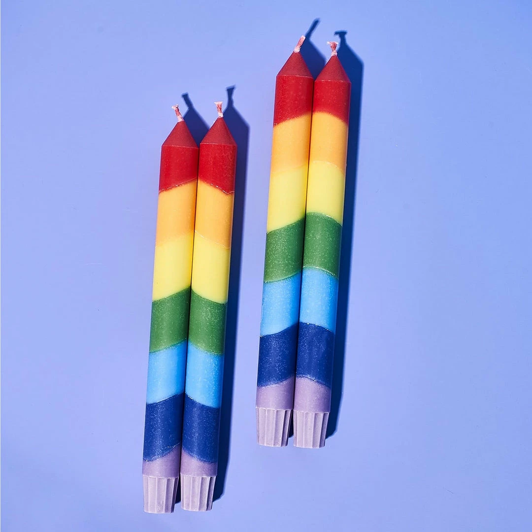 Donโt sit on this statement taper candle set! All four rainbow colored tapers give your space that extra bit of fun to cheer up the day. Features a side swept rainbow that gives us tropical vacation vibes. Plus itโs dripless so you donโt need to worry about clean the taper candle holders after!! Each one is made lovingly and with consideration to the environment and equity to the people producing it.
