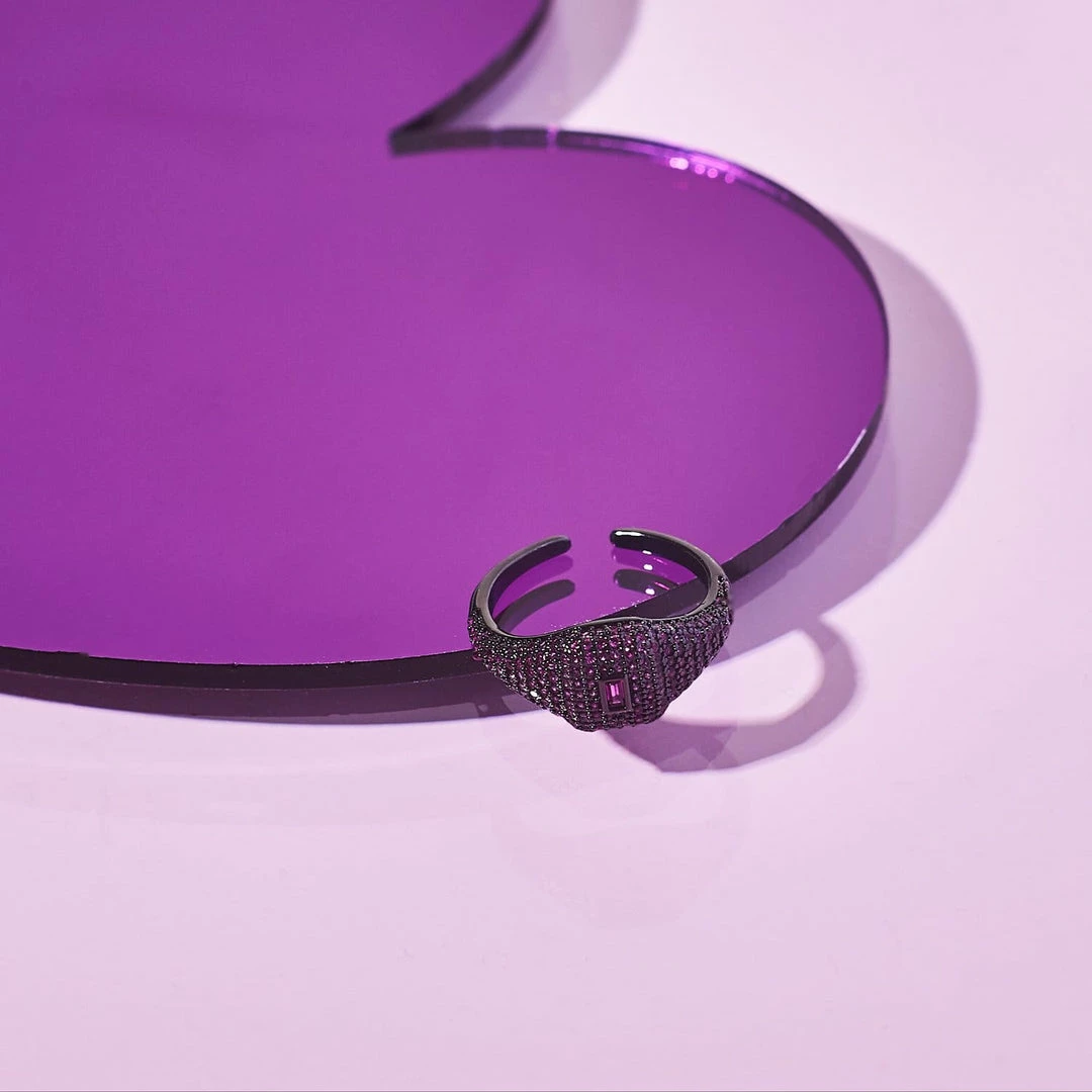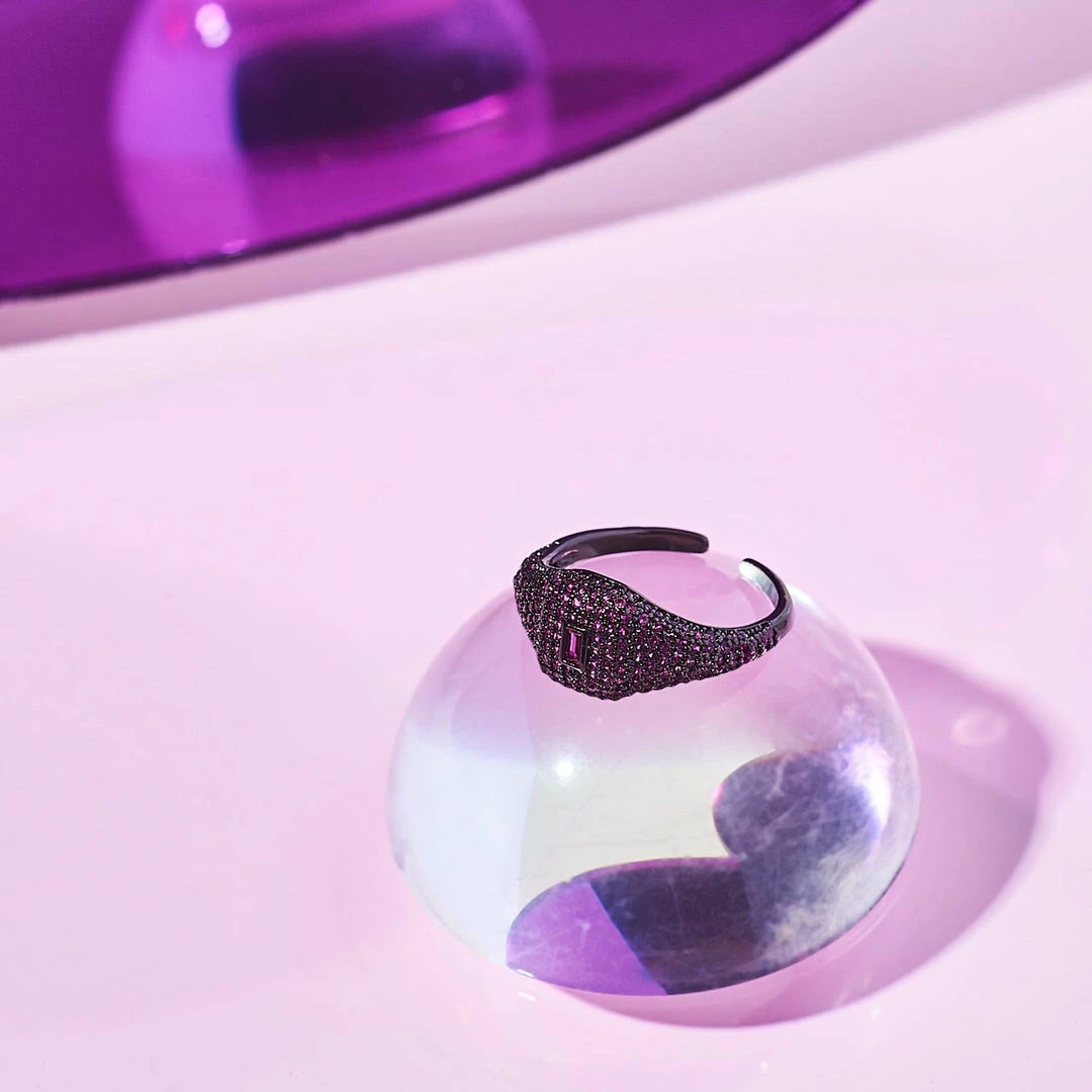 Give gothic holiday vibes with this deep purple signet cocktail ring. Wrapped in purple CZs throughout the entire ring band, features a magenta colored centered CZ for contrast.ย