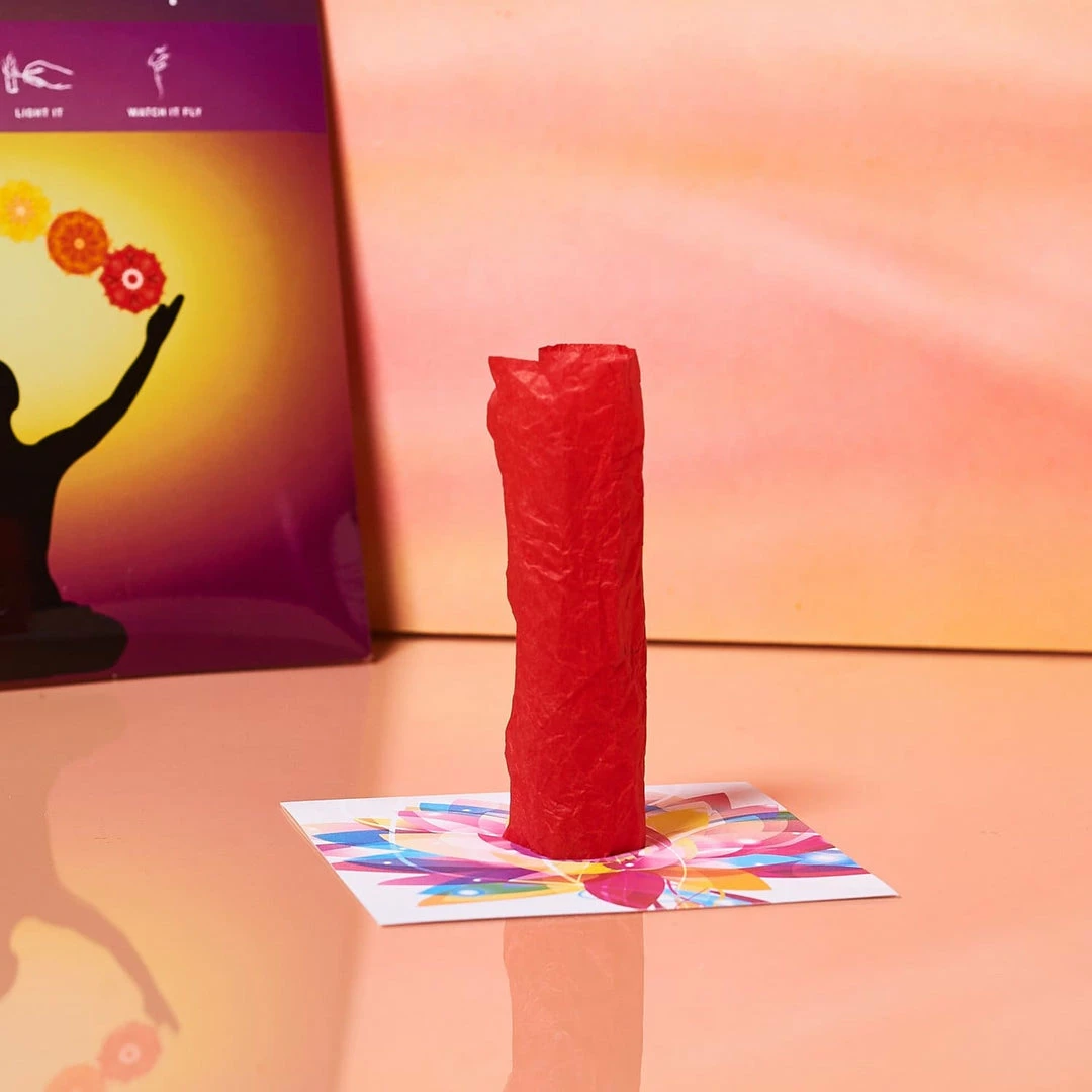 To use, write you wish one of the red papers. Roll up & shape your paper into a tube so that it can rest on the platform base. Take a matchstick or lighter and ignite the very top of the wish paper tube. As the paper burns down, you release your wish up into the universe.