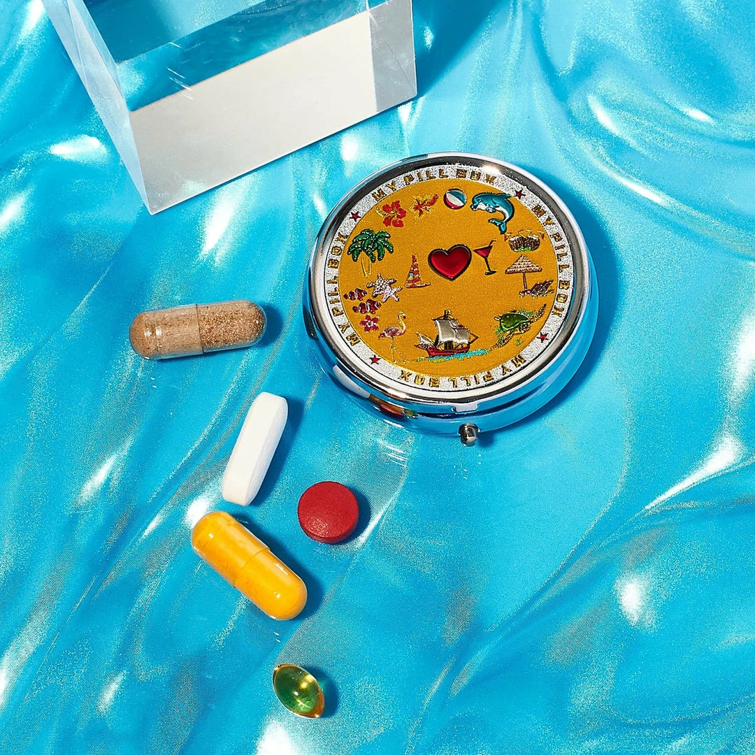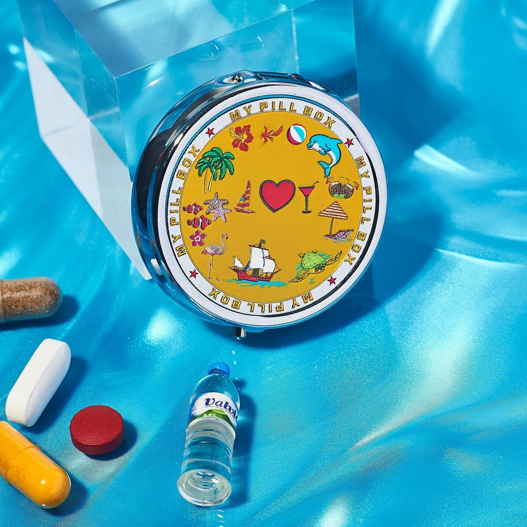 Keep those pills with you wherever you go with this colorful & cute small pill box. This fun accessory features a “My Pill Box” inscription wrapping around. Featuring little motifs of flamingos, boats, starfish, dolphins, beach ball, martini, and more. This convenient sized box can fit in your pocket, purse, or travel bag.