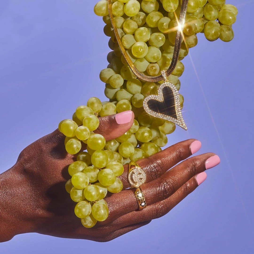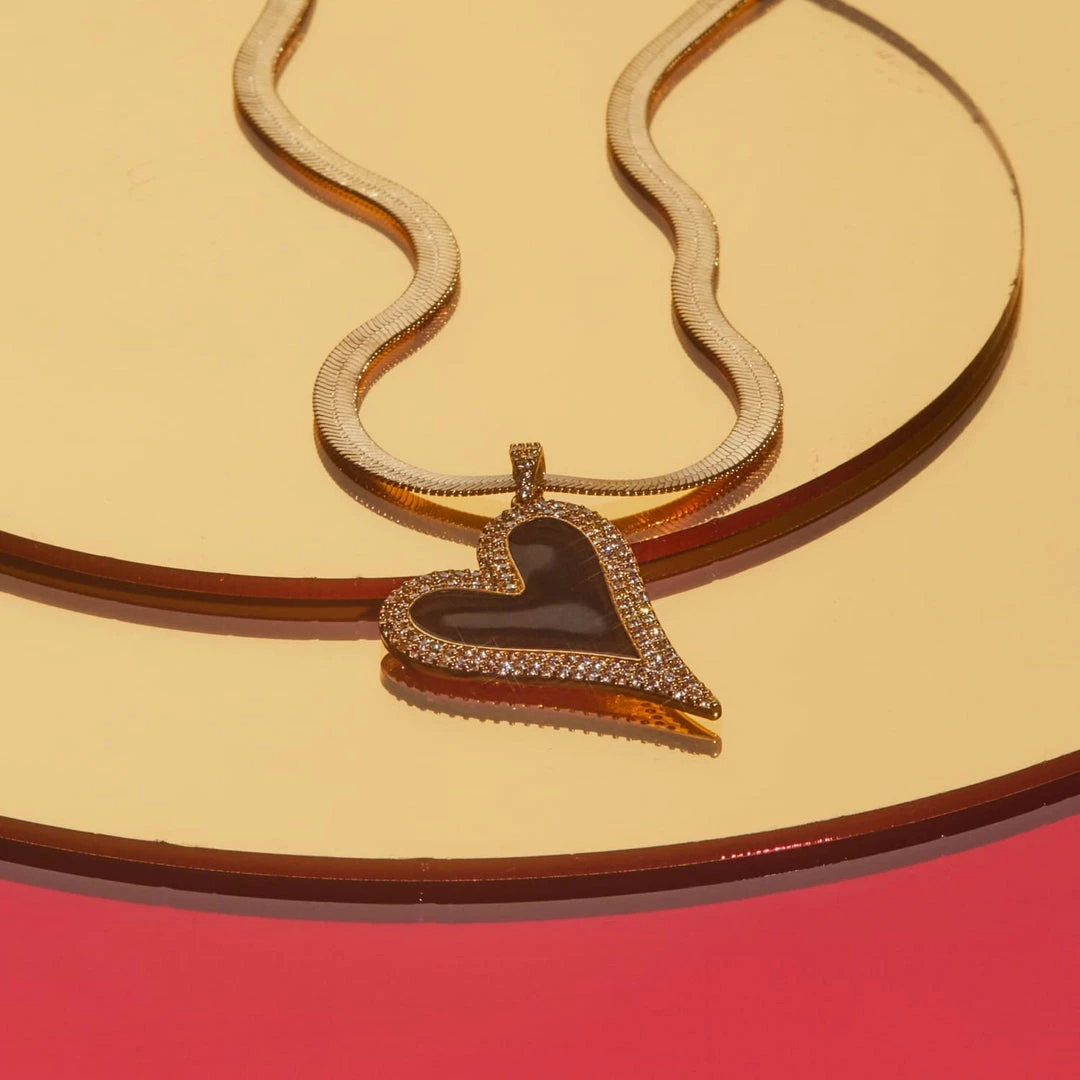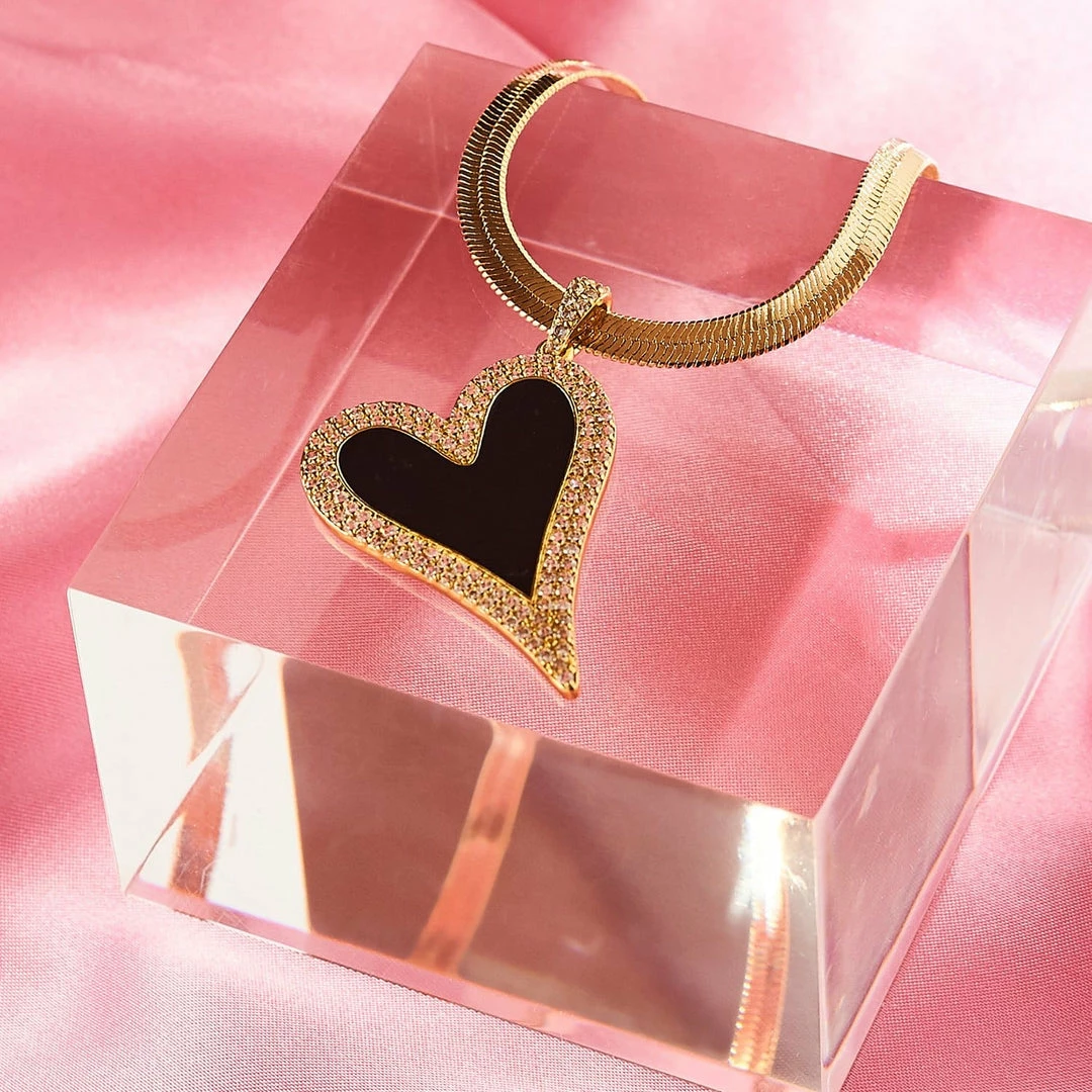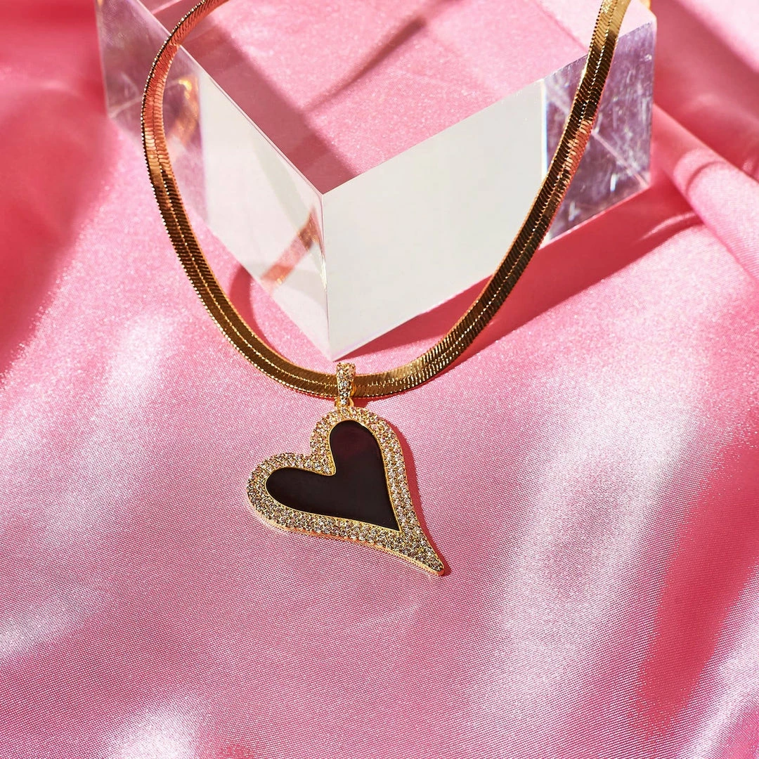 Gift a heart full of bling this Valentine’s Day! Pair this black, CZ adorned enamel heart necklace with cocktail dresses and dressier office looks alike. Pendant rests flat on a herringbone chain.