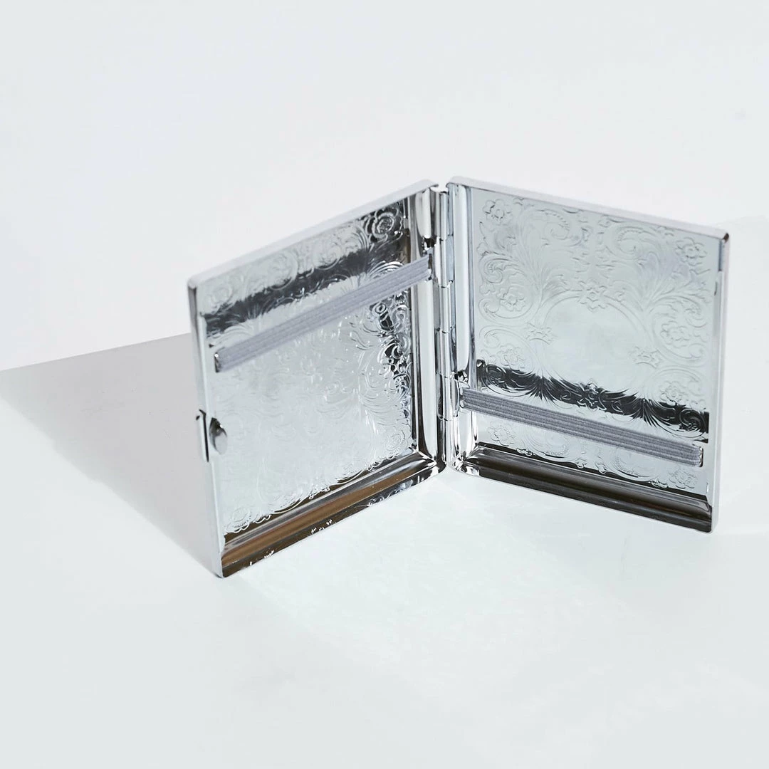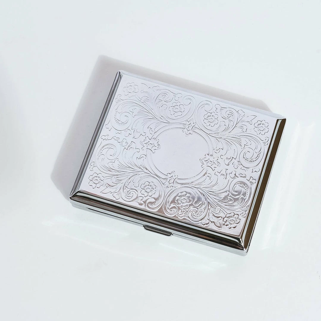 Made of durable metal with a high polished chrome finish and floral swirl design on its surface. This card case also doubles as a cigarette holder!