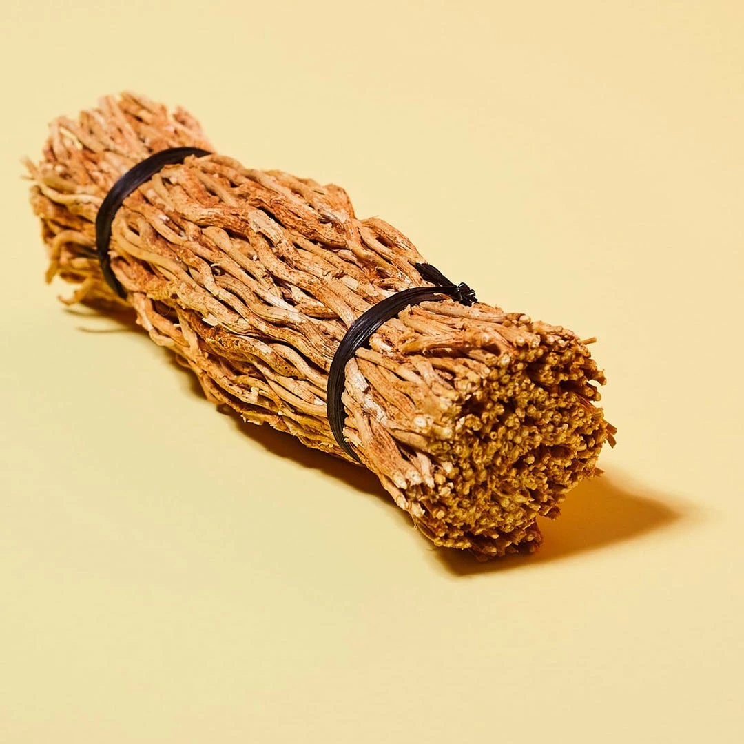 These bundles of vetiver root are both decorative and functional – they release a subtle and intoxicating smell and also look cute on a shelf. Vetiver is a good insect repellant and also makes cupboards and drawers smell oh-so-nice. To revive the odors of the bouquets humidify or place in water for one or two minutes every 2-3 months.