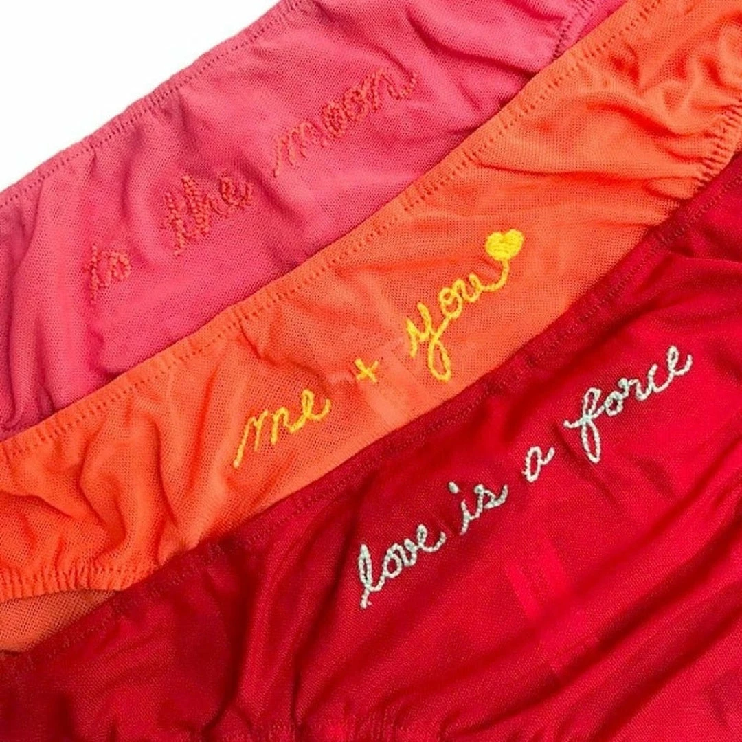 Perf for Valentineโs Day, this written word embroidered panty is giving off serious couple vibes. Embroidered in yellow thread on warm orange mesh fabric at center of panty is, โme & youโ dotted out with a heart. Bikini provides good coverage but is def a lil cheeky ๐
