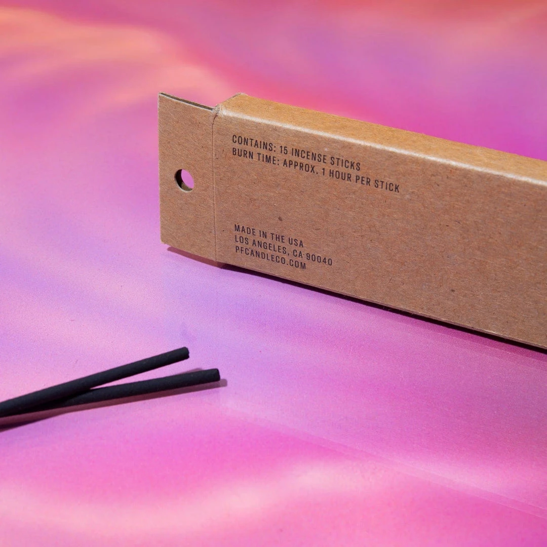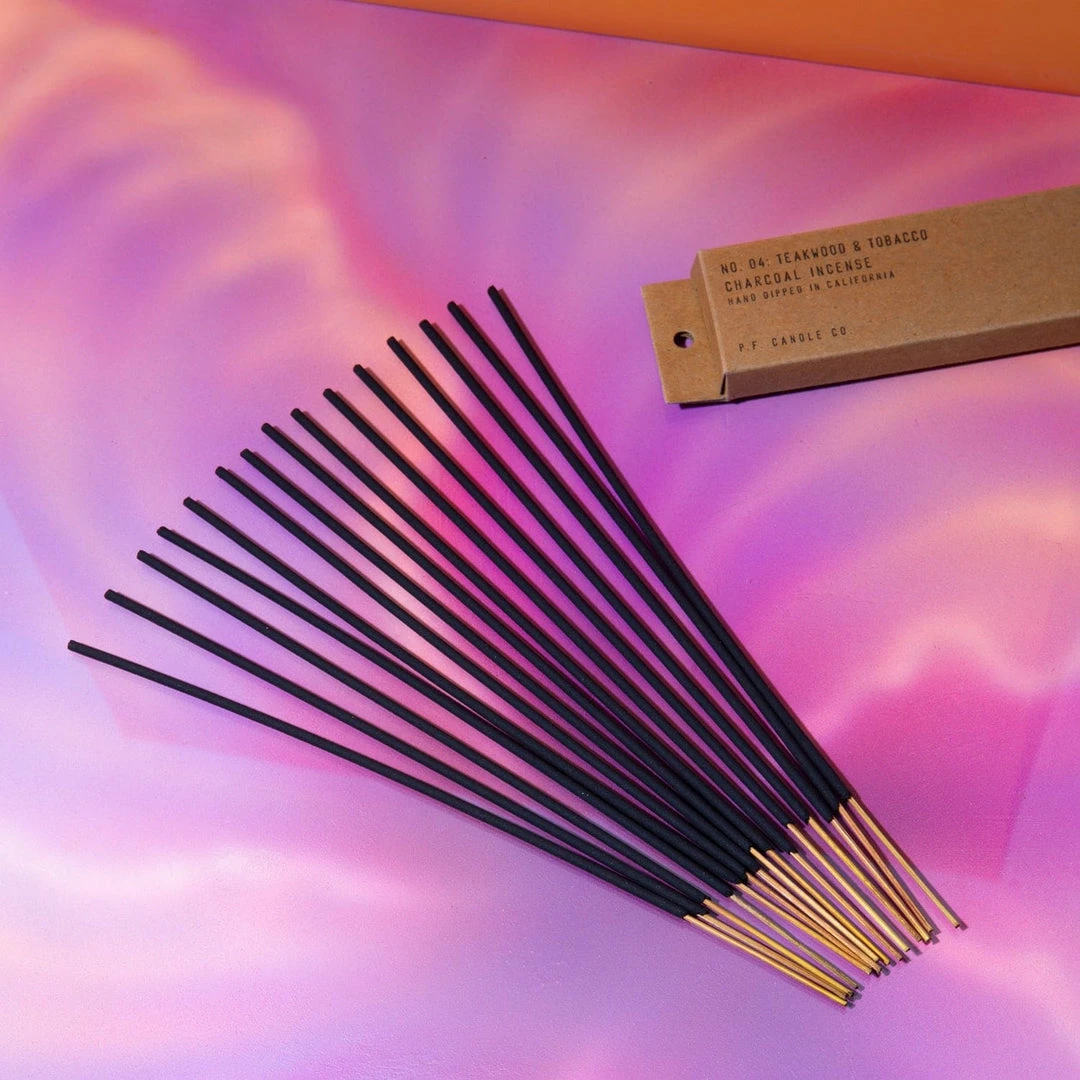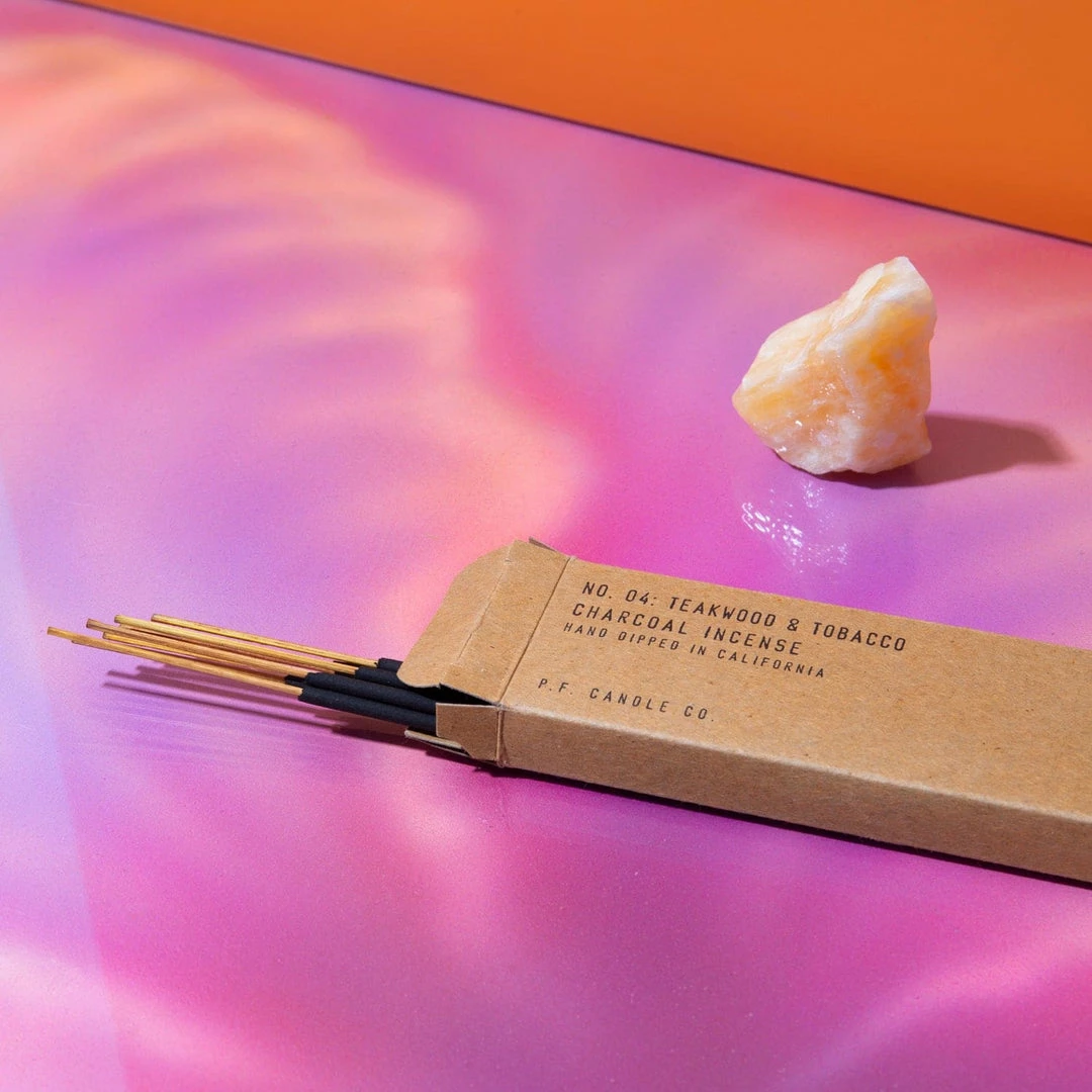 These charcoal-based incense burn P.F. Candle Co.’s signature scent: teakwood & tobacco. Hand-dipped and packaged in kraft boxes, the incense sticks quickly transform a room and uplift the space, lingering for hours after extinguishing. 15 sticks per pack.