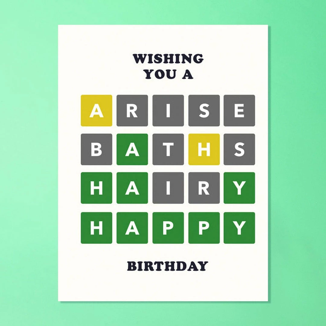 Wordle is all the craze right now! Front of card features the famous word game set up with a 6th row result of HAPPY to start off the birthday cheer! Don’t let the double letter throw ya ๐