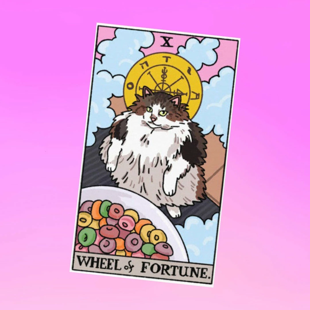 Tarot but in cat meme form!Β Because it is waterproof, you can use this sticker for water bottles, bikes, laptops, cars, phone cases and more! Die cut sticker is designed like a tarot card, highlighting a chonky cat sitting in front of a Wheel of Fortune and behind a bowl of Fruit Loops.