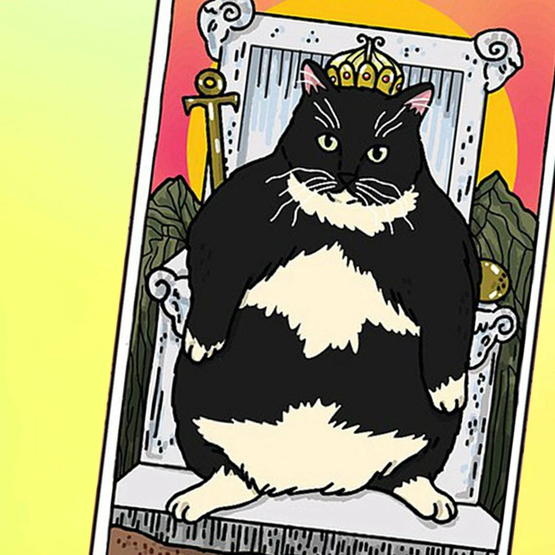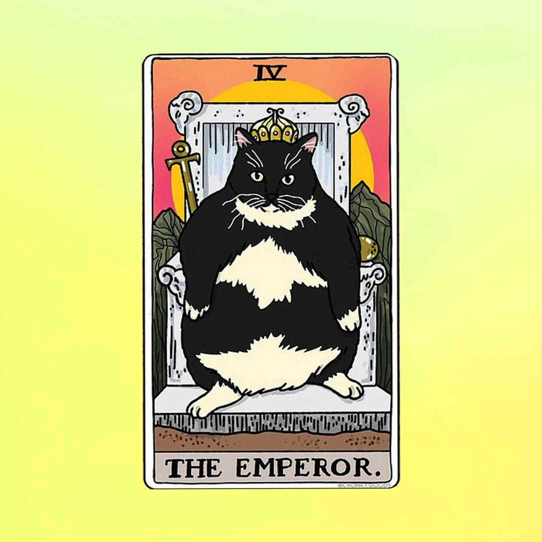 Tarot but in cat meme form! Because it is waterproof, you can use this sticker for water bottles, bikes, laptops, cars, phone cases and more! Die cut sticker is designed like a tarot card, highlighting a black and white chonky cat posing in a throne with a grand crown on its head.