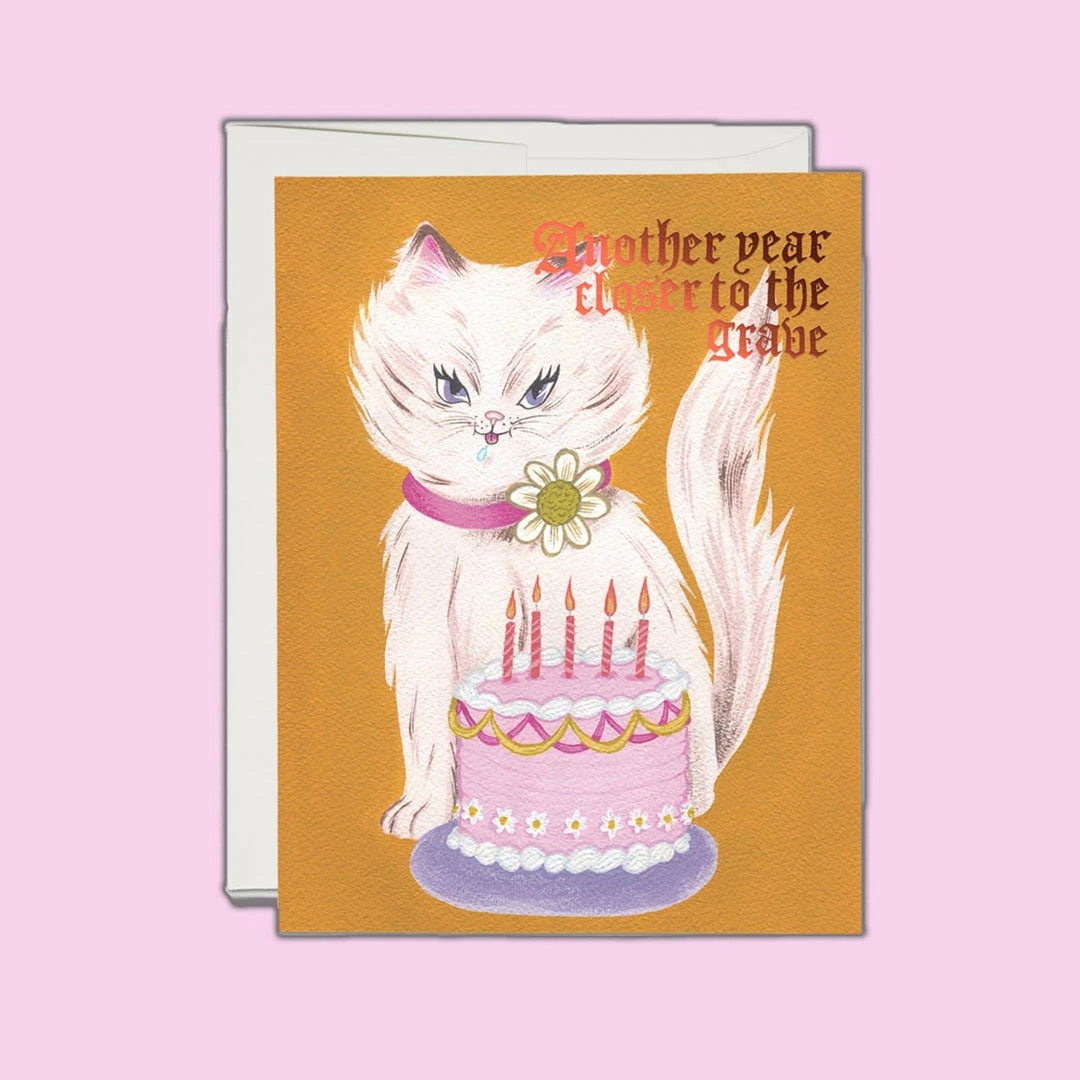 Sprinkle in some lighthearted cynicism on top that birthday cake LOL. Front of card reads “ο»ΏAnother year closer to the grave”Β ο»Ώcontrasted by a prissy feline and their birthday cake.
