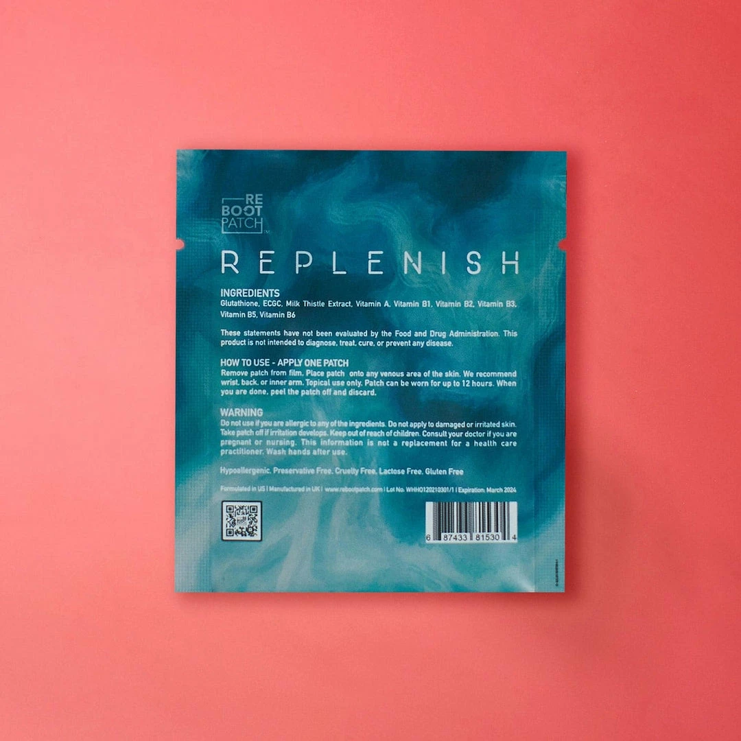 Wake the f&#% up with some help from Replenish by Reboot Patch. Made to get your body moving and grooving after a little longer than expected night out. Infused with good things like glutathione, ECGC, milk thistle extract and B vitamins to detox. And did you know this patch is hypoallergenic, vegan, cruelty-free, and made with no preservatives, or gluten