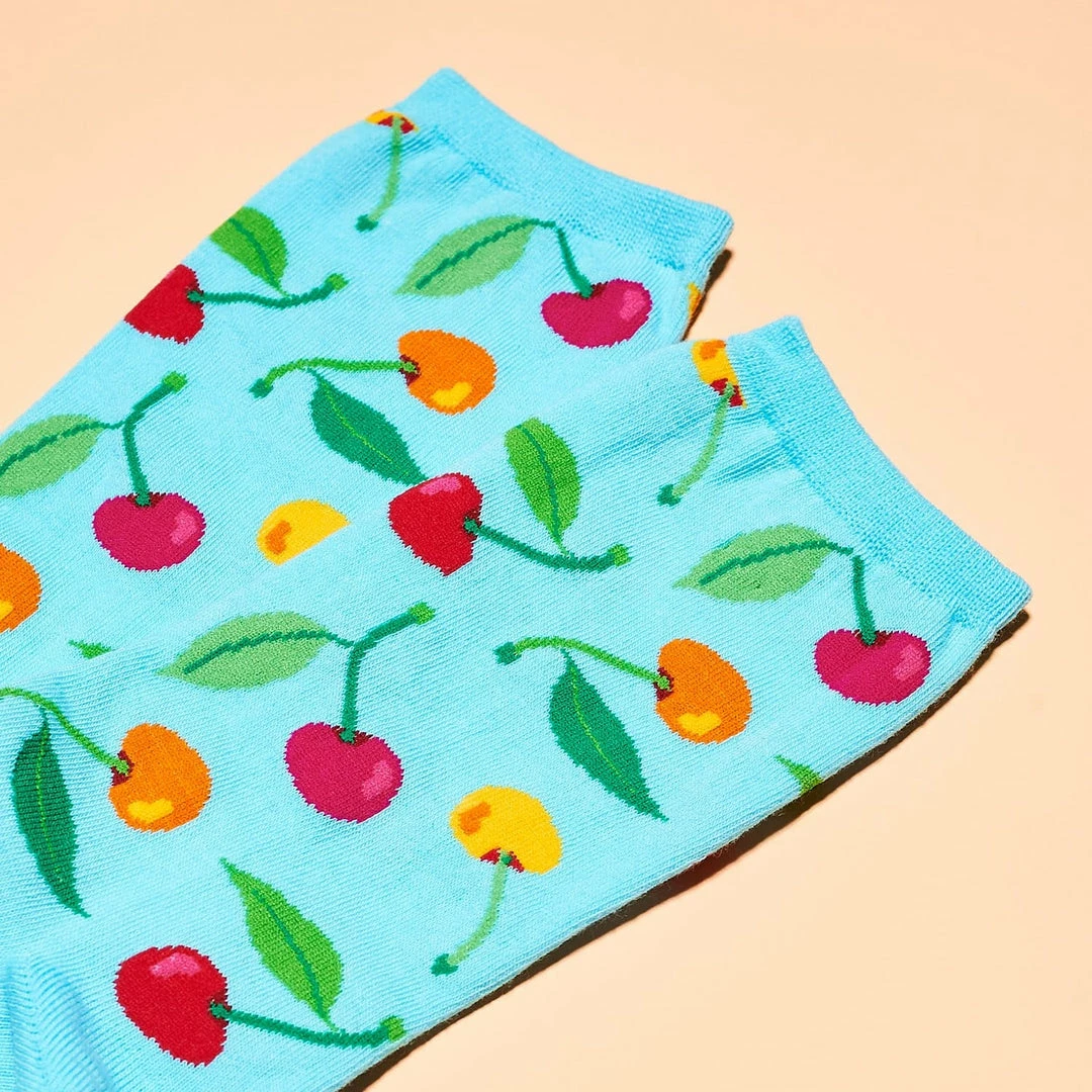 These novelty food socks are the cherry on top to any look. These vibrant cotton socks are adorned with multicolored cherries with bright green stems.