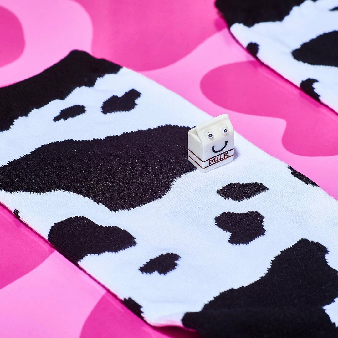 An udderly perfect pair of animal print socks! Add a subtle touch of cow print to your outfit with these novelty socks. Majority of the sock features your traditional black and white cow print, with the toes outlined in a creamy pink to mimic a cow’s udder. Get this moo-d on your feet.