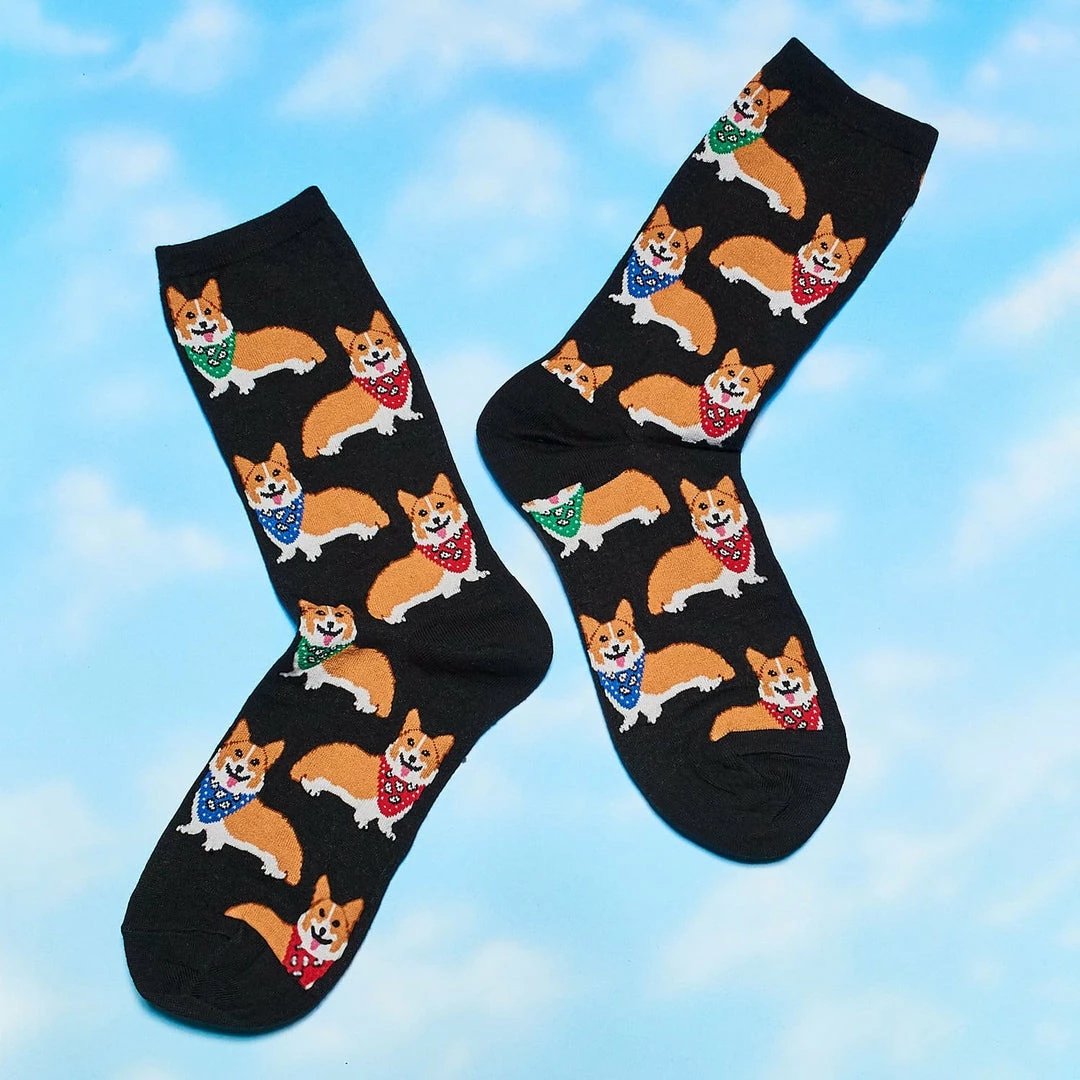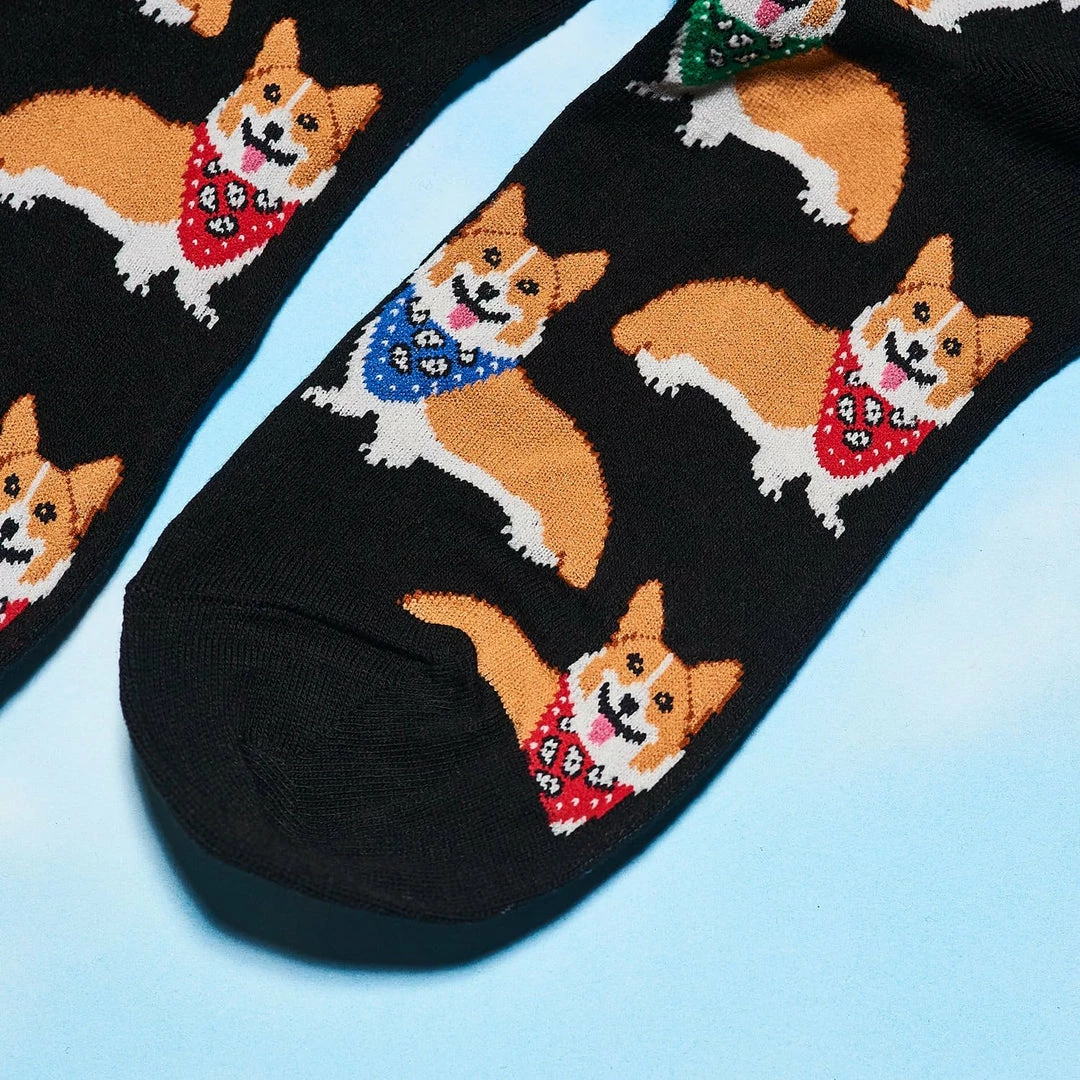 Sport that corgi chonk all day with these dog novelty socks. Bandana wearing corgis fill the scene from top to bottom on the black cotton sock.