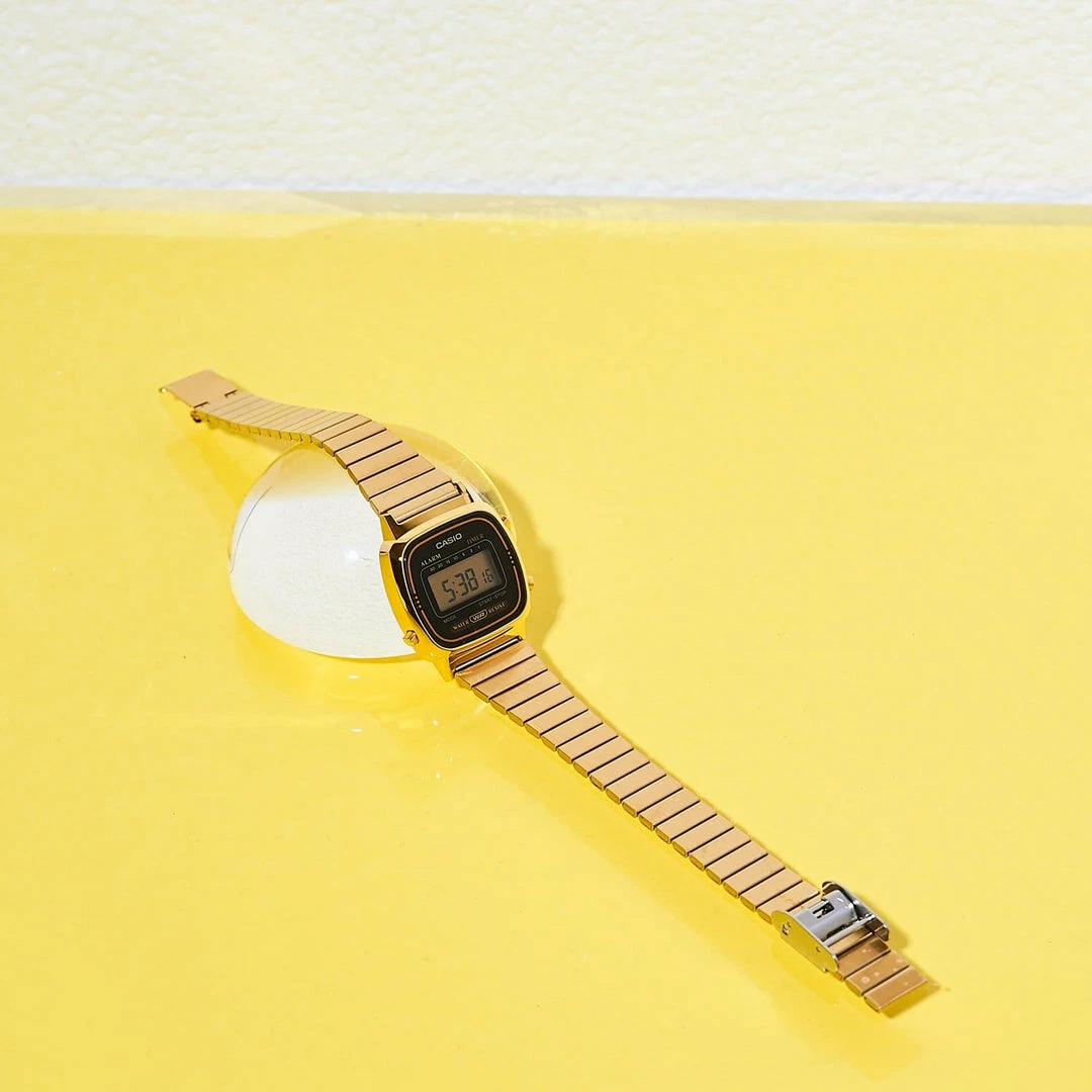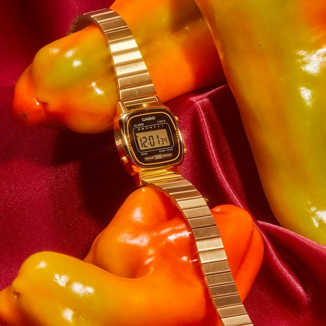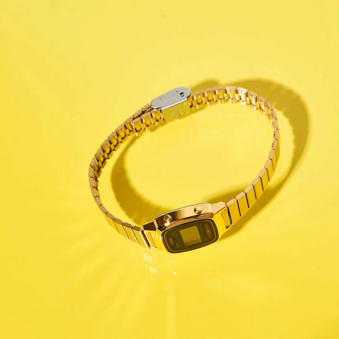 We love this classic Casio watch design (from the 1980s!) – it’s a watch plus so much more. This gold metal Casio watch has a stopwatch and a countdown timer, plus a daily alarm, hourly time signal, and auto calendar.