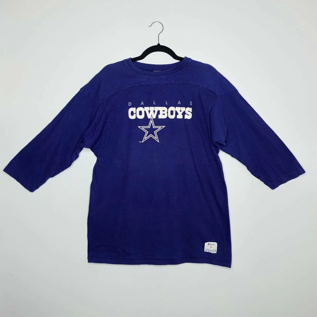 Because you wanna be a cowboy baby! Keep it casual in this 90s Dallas Cowboys genuine Champion jersey tee. Front of shirt features the team name with an off-center Lonestar logo beneath. Made with that single needle stitch that we love so much, right in the USA.