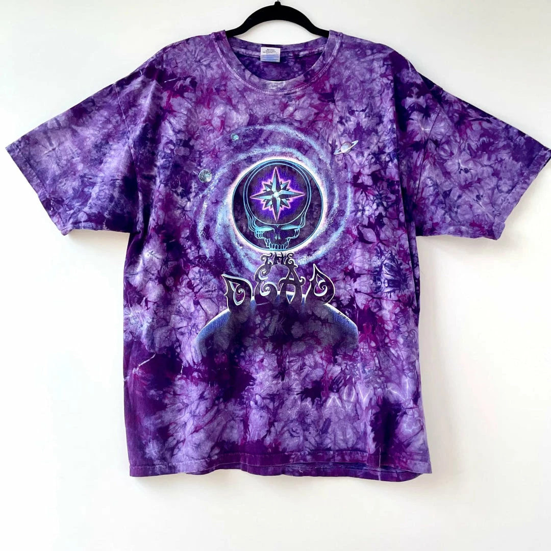 Take a trip back in time to 2007 with this Grateful Dead tour T-shirt. Purple tie dye base with the signature dead head skull and groovy text reading “The Dead”. Deadheads skull features a compass within, a distinction from the typical lightning bolt.