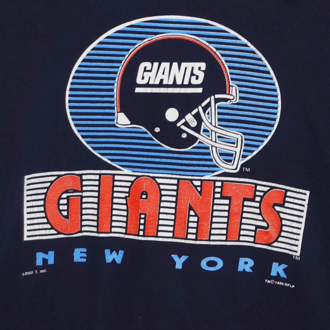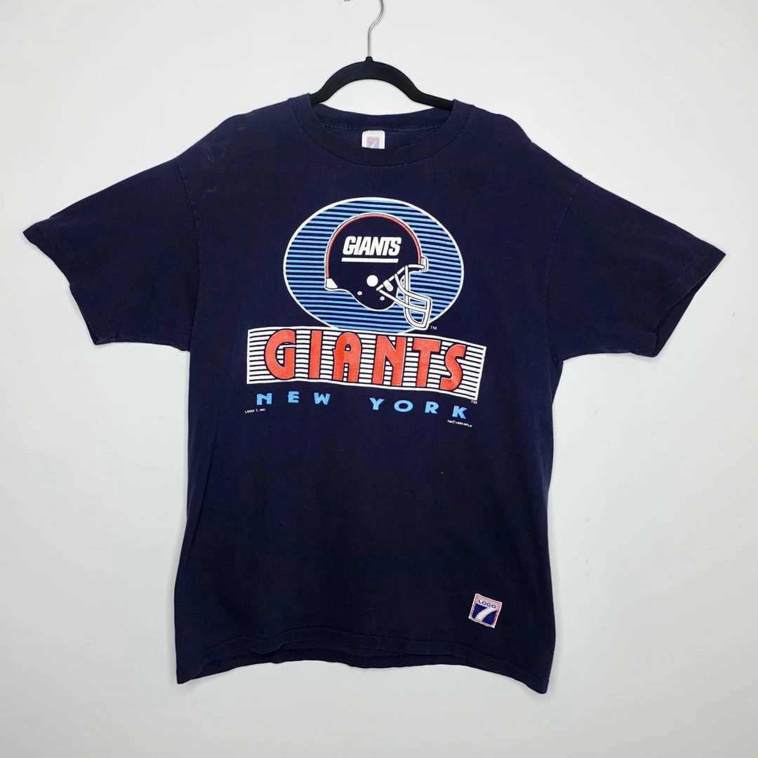 Gotta love the home team! 1990 year, cotton New York Giants merch shirt. A bit more of a true blue in person versus what is captured here. Graphic itself has some wear but is still in great shape. An ideal piece to show up andย to the next Giants football game. Made in USA.