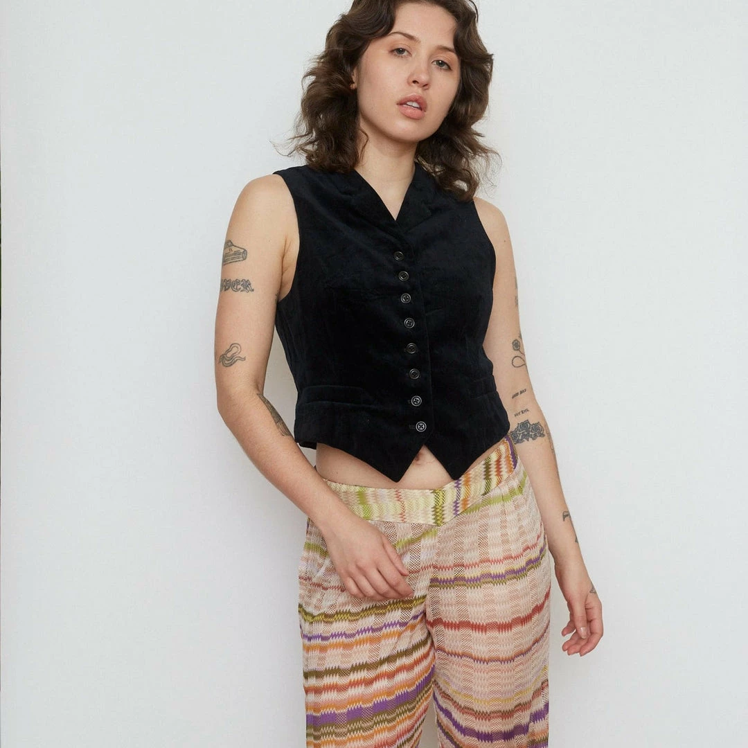 Wear this vintage vest solo or layered over another shirt to give a contrasting look. This luscious, black velvet Ralph Lauren vest keeps it classy and monotone with black buttons. Truly a foundational styling piece that you will have in your closet forever. Landing just in time for the predicted 2022 twee trend revival! Pictured here with vintage Missoni Pants.