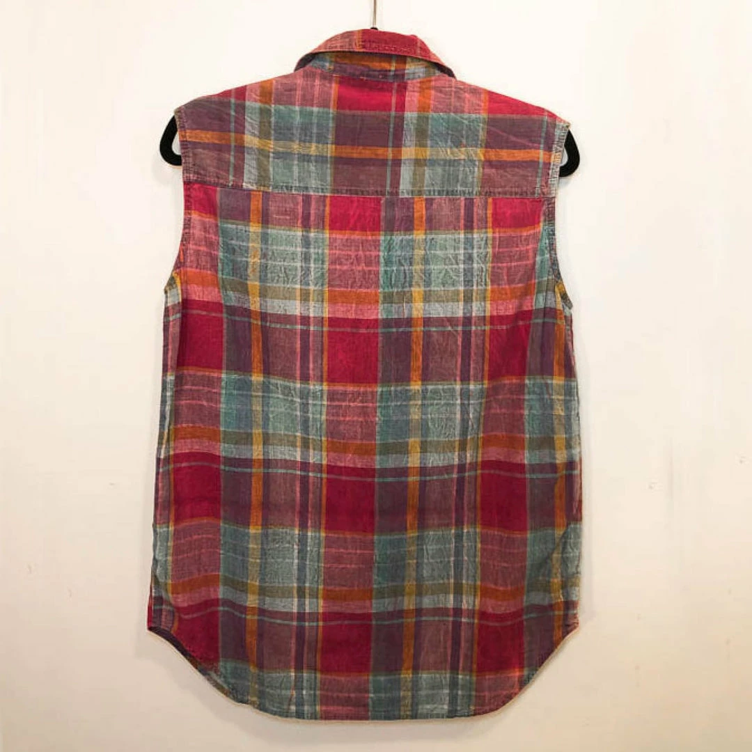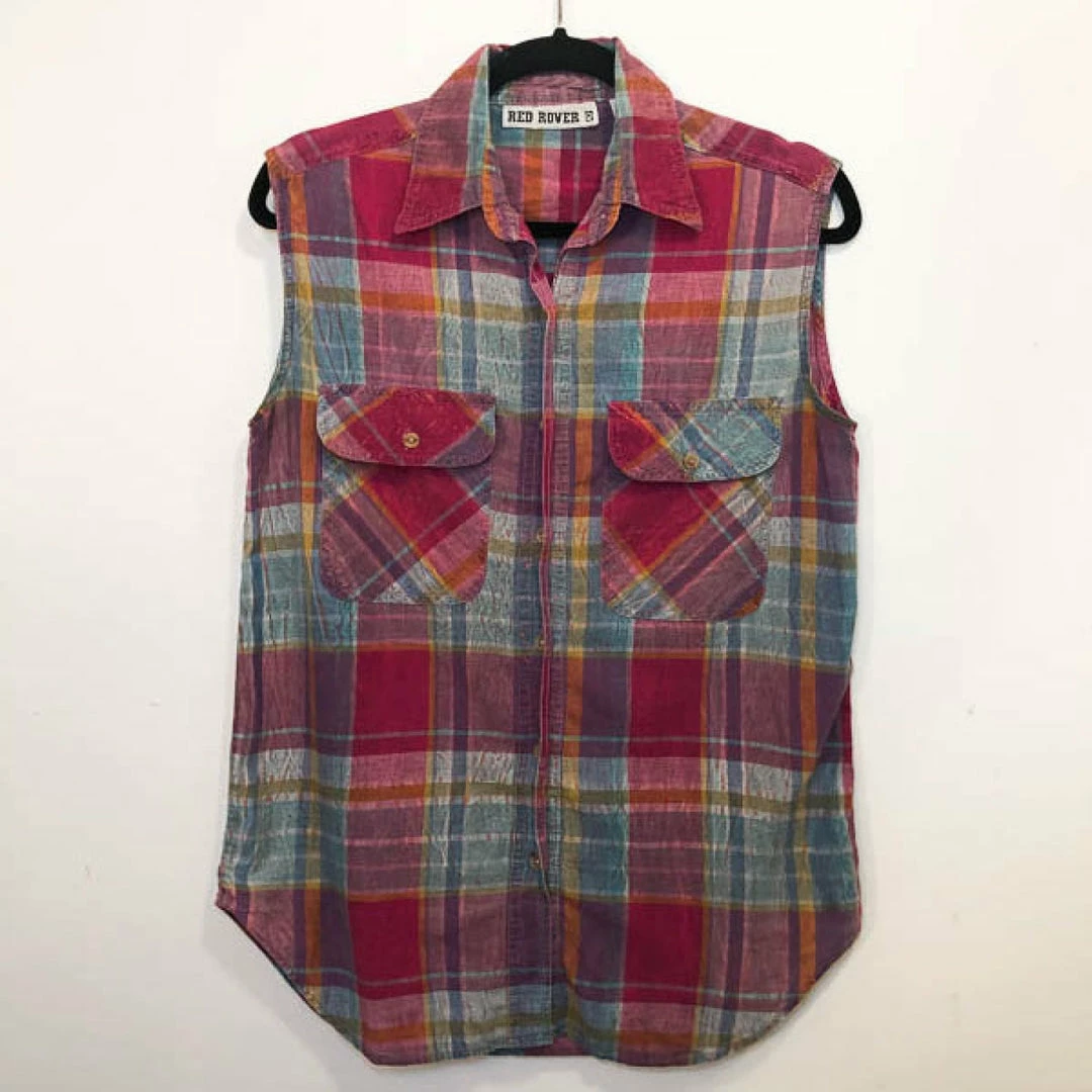 Brightly colored vintage plaid top from early 90s brand, Red Rover. Perfect for the summertime given its lightweight material and vivid colors. Wear it on its own or leave a few buttons open on the bottom to knot it into a cropped tank. Get yourself a pair of high rise denim shorts and youโll have the full western cowgirl aesthetic. Please note that the material does have a crinkle gauze affect, as shown in detail photo.ย
