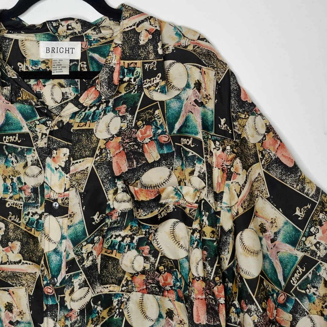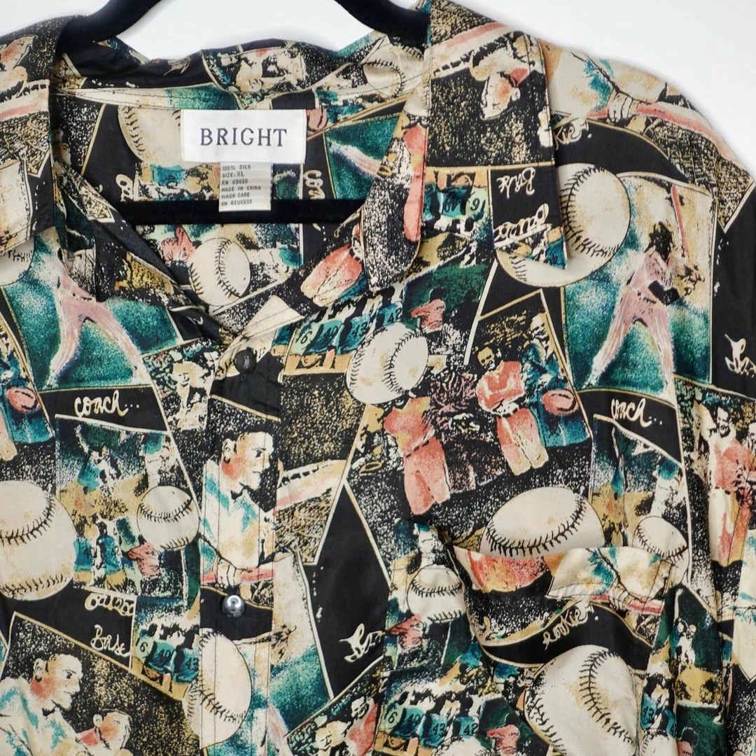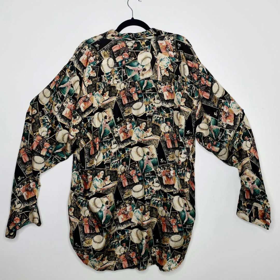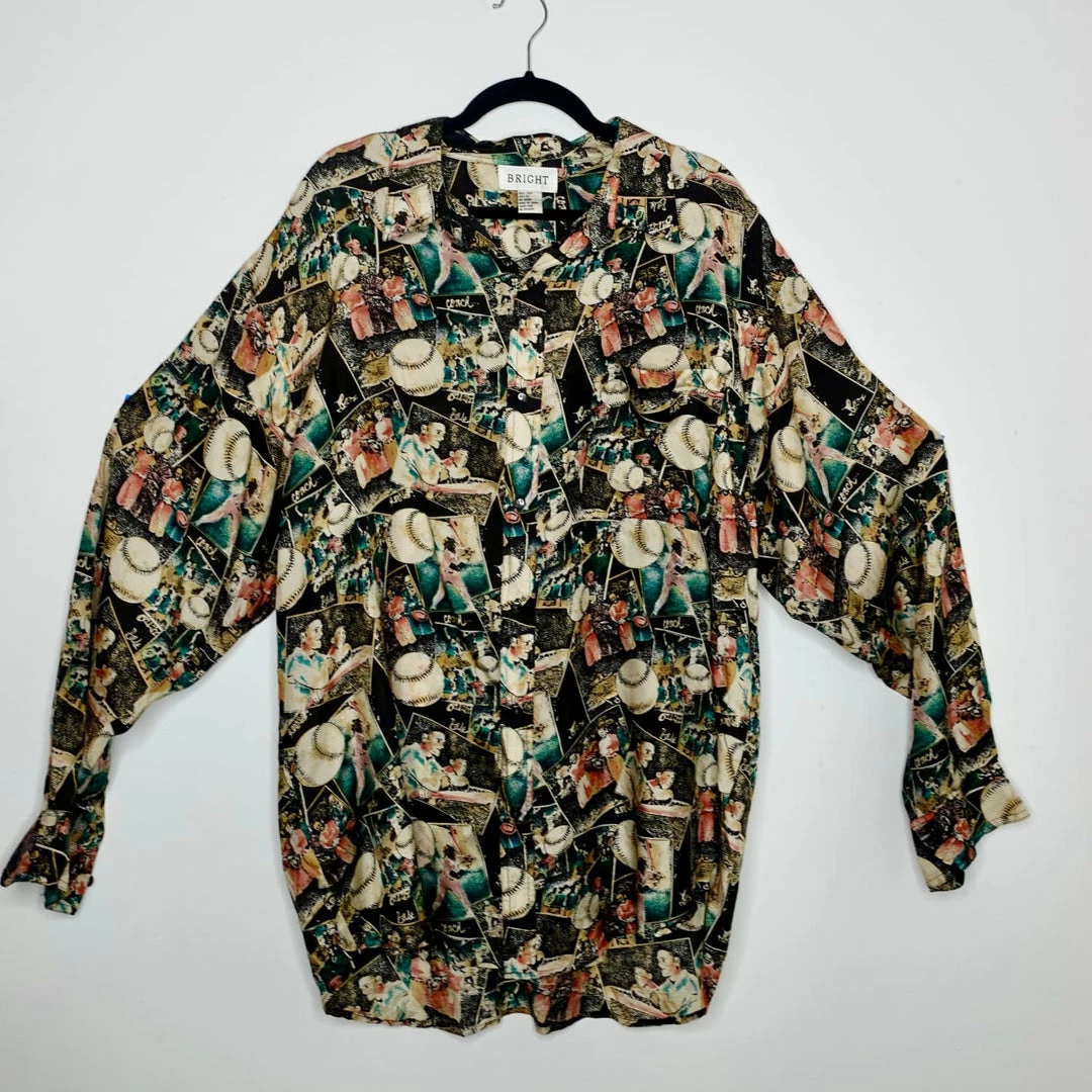 Come up to the fashion plate and hit one outta the park with this 80’s era baseball scene printed silk blouse. There is more detail in the shirt than you think so be sure to take a good look. Wear America’s favorite pastime in a artful way, featuring NY Yankees legend’s Roger Maris, Mickey Mantle, Reggie Jackson, and Lou Gehrig. Style as an oversized, dress fit vs collared button down.