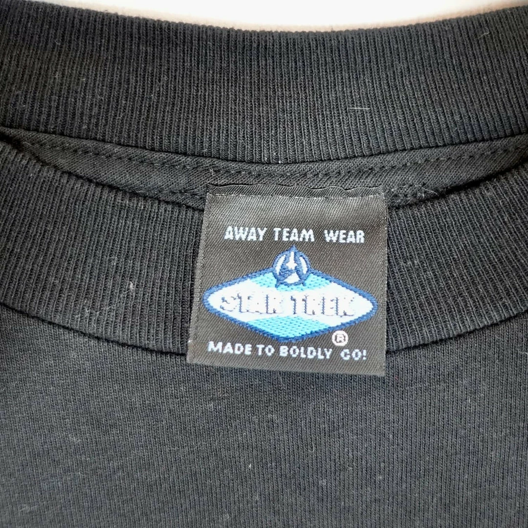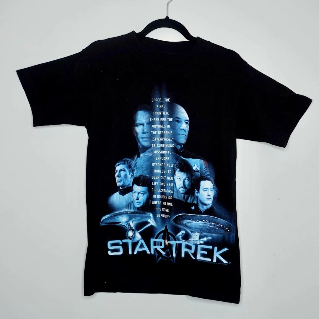 Are you a Trekkie? Then you will be obsessed with this vintage Star Trek show shirt – uniting the original series and The Next Generation. Front of shirt features characters in a blue silhouette with faves like Captain Picard, Lt. Data, Spock and Captain Kirk. Centered between the two series stars is the famous “To boldly go where no has gone before!” quote. Authentic Star Trek Brand tag.