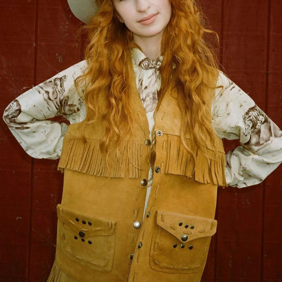 Wondering what to wear with a fringe vest? Keep it simple and put it with a graphic button up for an elevated cowgirl aesthetic look. We’d suggest our recent vintage western button up drops like: