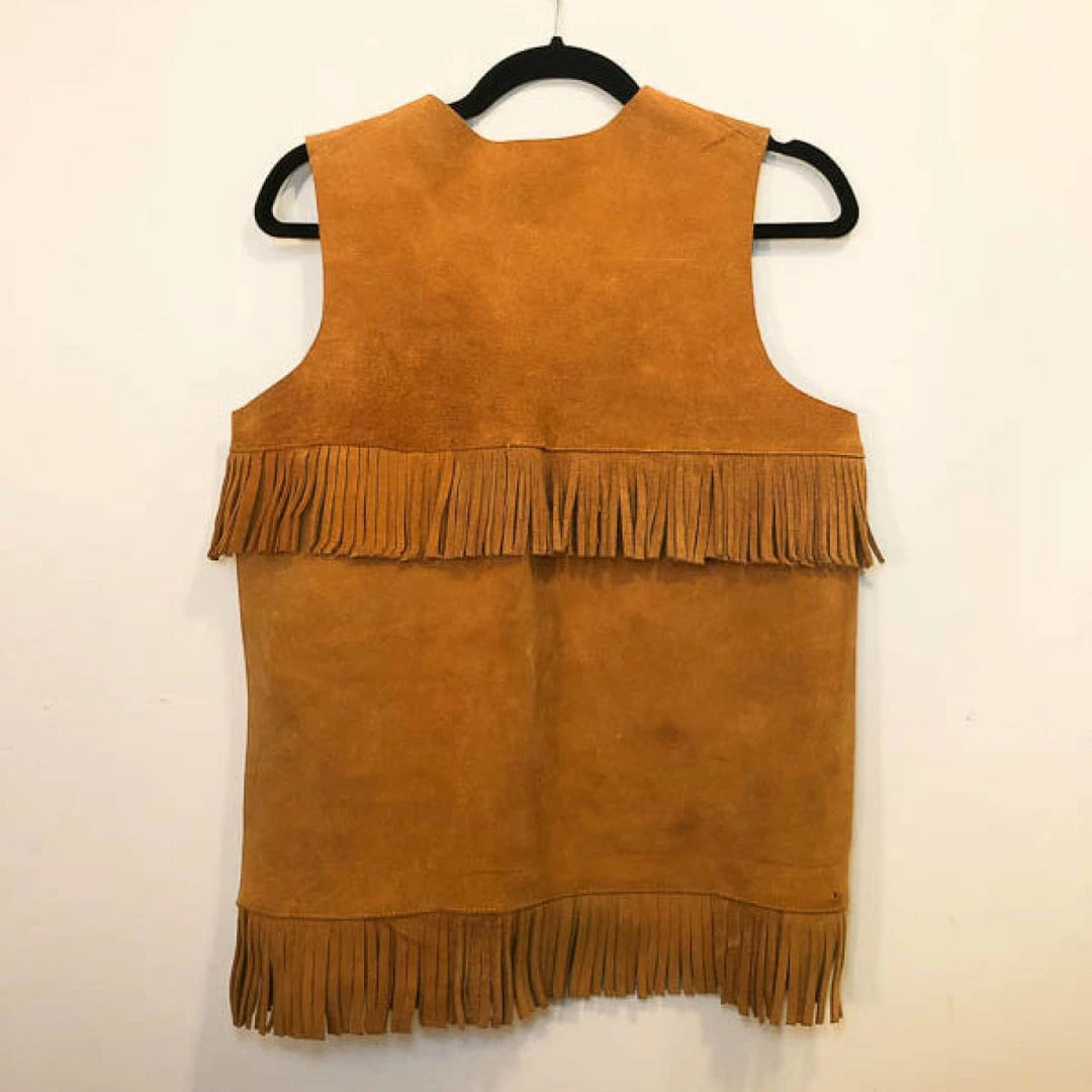 Don’t want to commit to a fringe jacket? This vintage suede fringe vest is for you! A traditional tan color, this neutral outer layer will look great with a range of colors. What we love the most is of course the FUN fringe! Also features snap buttons and pockets, giving this a slightly more contemporary feel. Overall good condition with a few small, not very noticeable spots.
